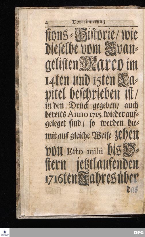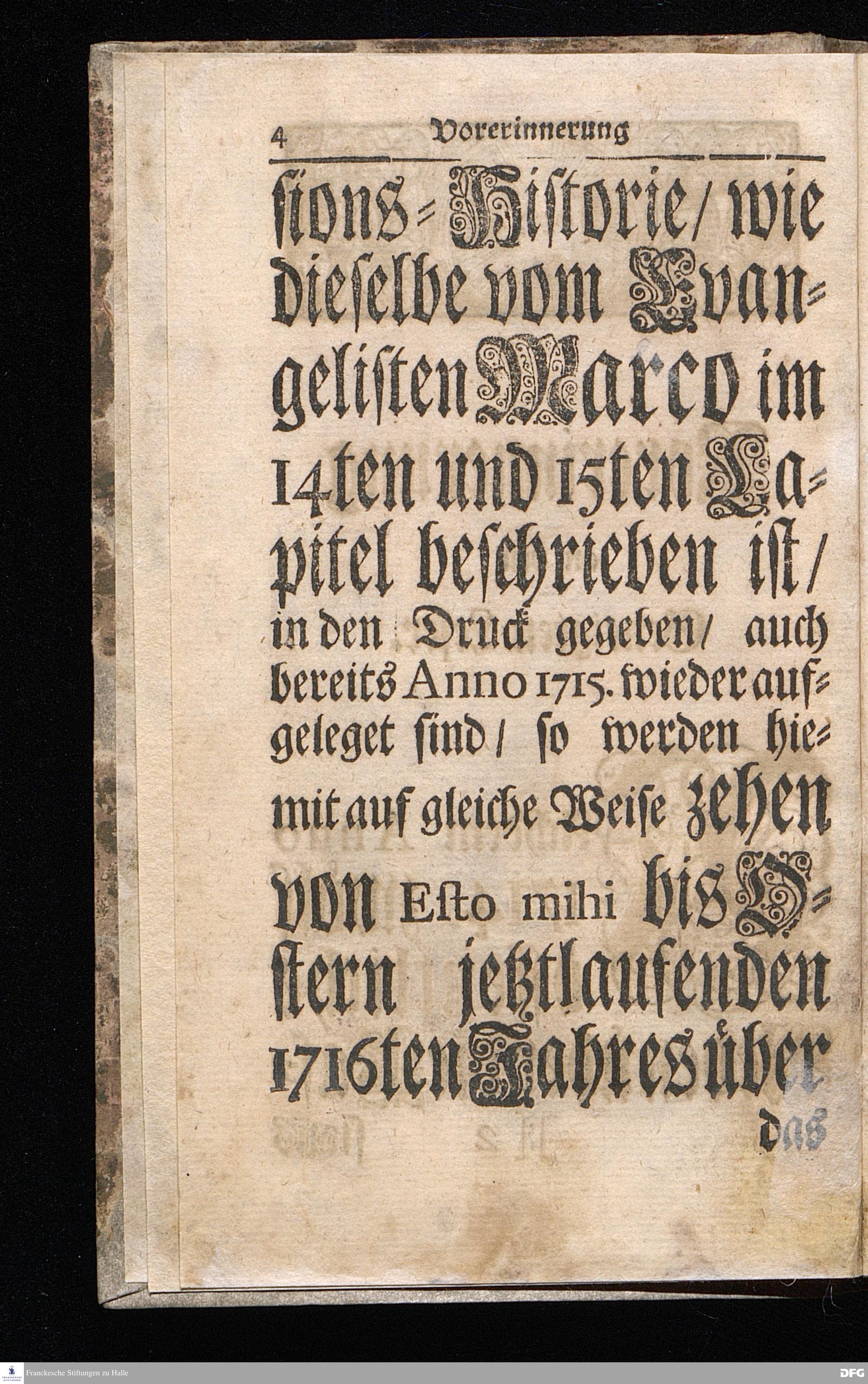 August Hermann Franckens / S.Theol.Prof.& Past.zu S.Ulrich und des Gymnasii Scholarchæ, Oeffentliche Reden über die Paßions=Historie / Wie dieselbe vom Evangelisten Johanne im 18.u.19. Cap. beschrieben ist / gehalten Von Esto mihi bis Ostern 1716. In dem Wäysenhause zu Glaucha an Halle. EDITIO II. HALLE / Gedruckt und verlegt im Wäysenhause MDCCXIX.