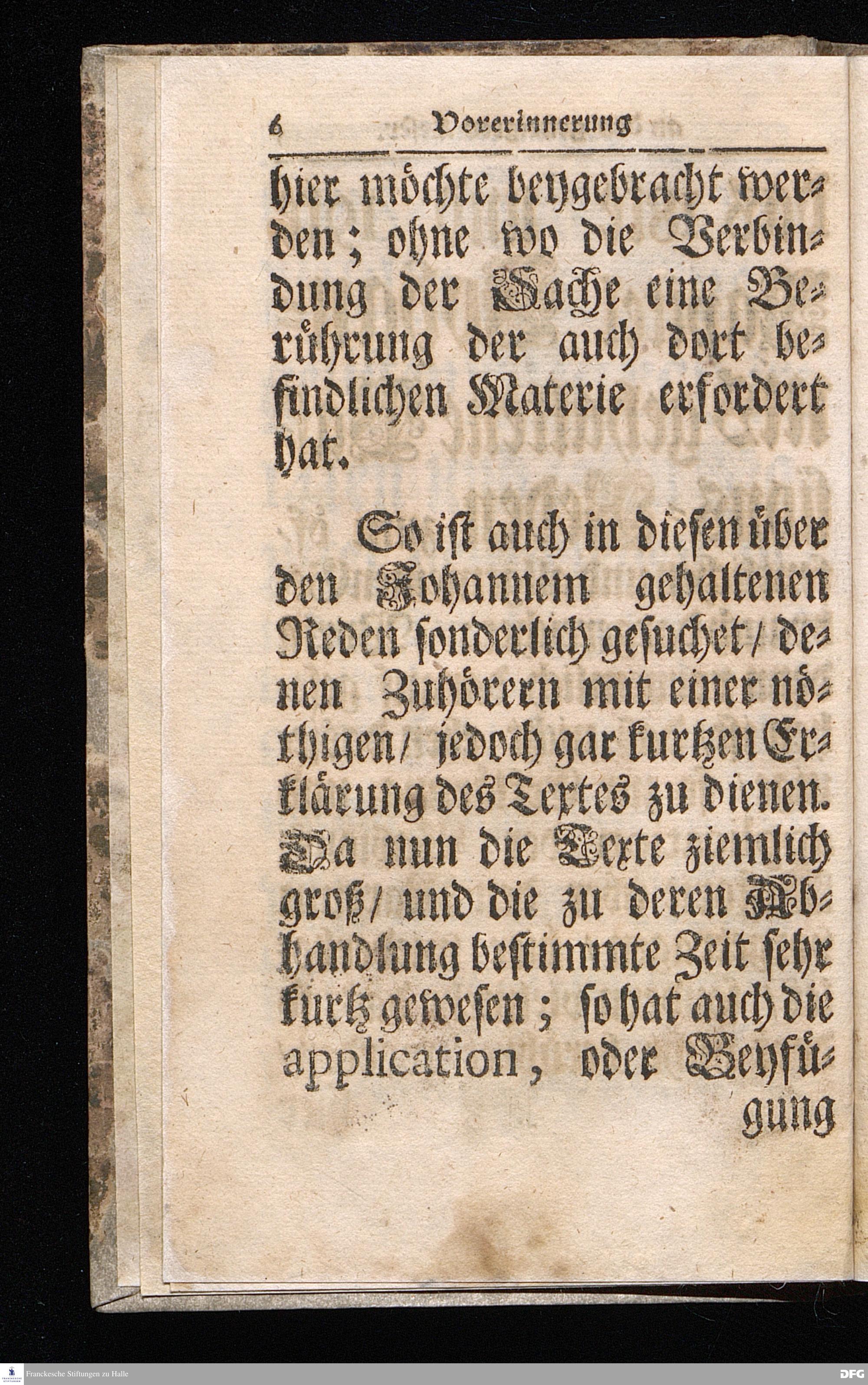 August Hermann Franckens / S.Theol.Prof.& Past.zu S.Ulrich und des Gymnasii Scholarchæ, Oeffentliche Reden über die Paßions=Historie / Wie dieselbe vom Evangelisten Johanne im 18.u.19. Cap. beschrieben ist / gehalten Von Esto mihi bis Ostern 1716. In dem Wäysenhause zu Glaucha an Halle. EDITIO II. HALLE / Gedruckt und verlegt im Wäysenhause MDCCXIX.