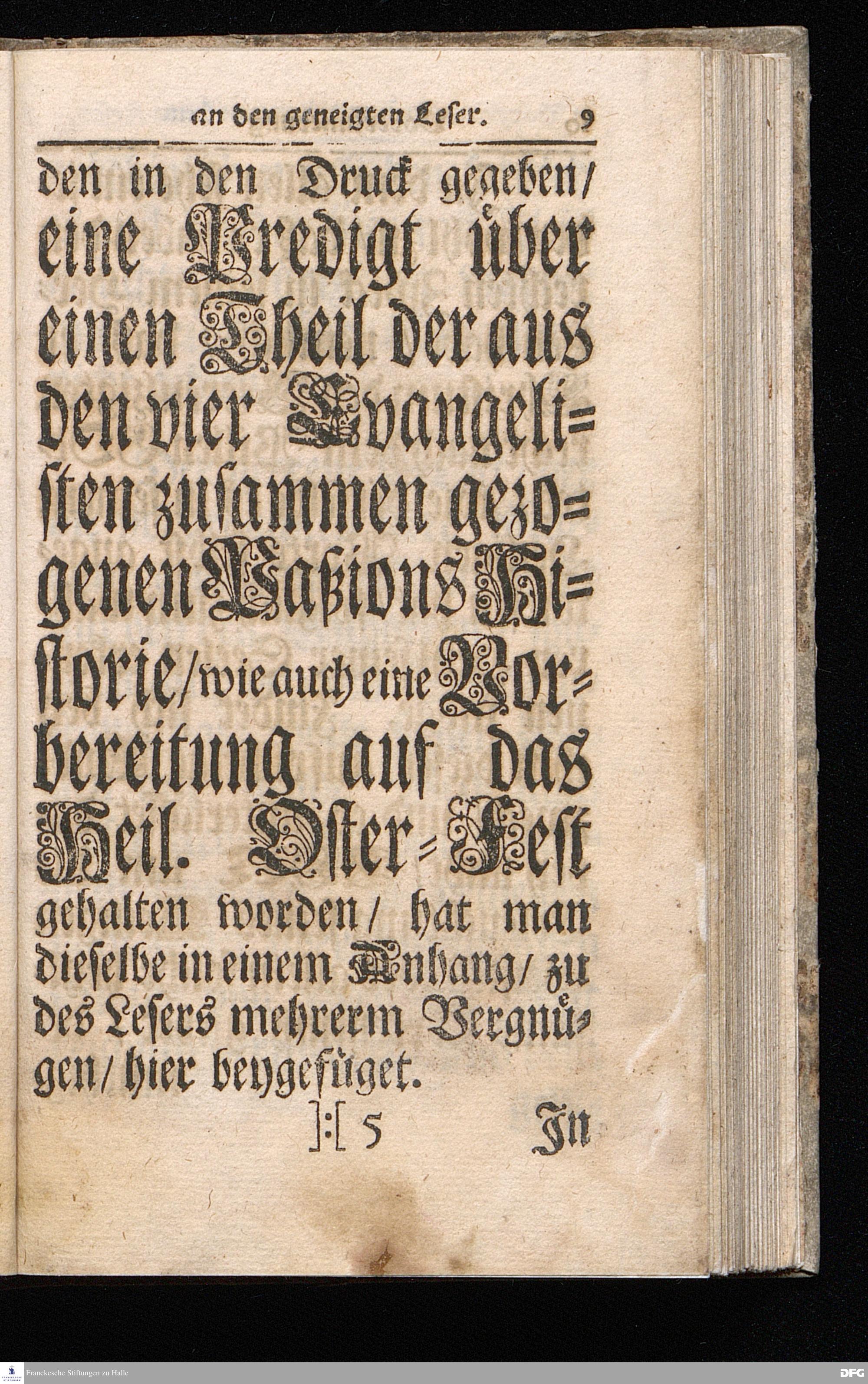 August Hermann Franckens / S.Theol.Prof.& Past.zu S.Ulrich und des Gymnasii Scholarchæ, Oeffentliche Reden über die Paßions=Historie / Wie dieselbe vom Evangelisten Johanne im 18.u.19. Cap. beschrieben ist / gehalten Von Esto mihi bis Ostern 1716. In dem Wäysenhause zu Glaucha an Halle. EDITIO II. HALLE / Gedruckt und verlegt im Wäysenhause MDCCXIX.