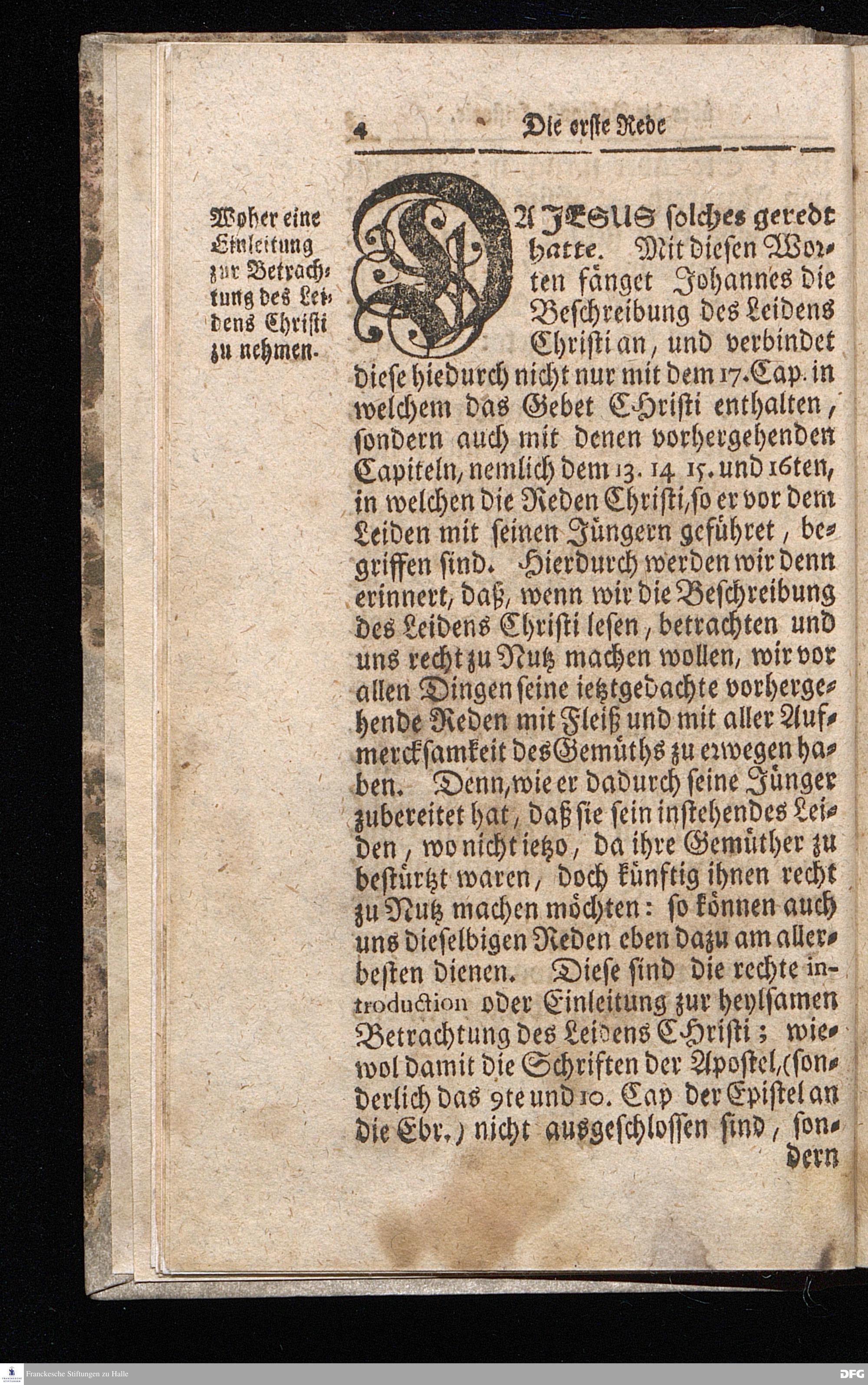 August Hermann Franckens / S.Theol.Prof.& Past.zu S.Ulrich und des Gymnasii Scholarchæ, Oeffentliche Reden über die Paßions=Historie / Wie dieselbe vom Evangelisten Johanne im 18.u.19. Cap. beschrieben ist / gehalten Von Esto mihi bis Ostern 1716. In dem Wäysenhause zu Glaucha an Halle. EDITIO II. HALLE / Gedruckt und verlegt im Wäysenhause MDCCXIX.