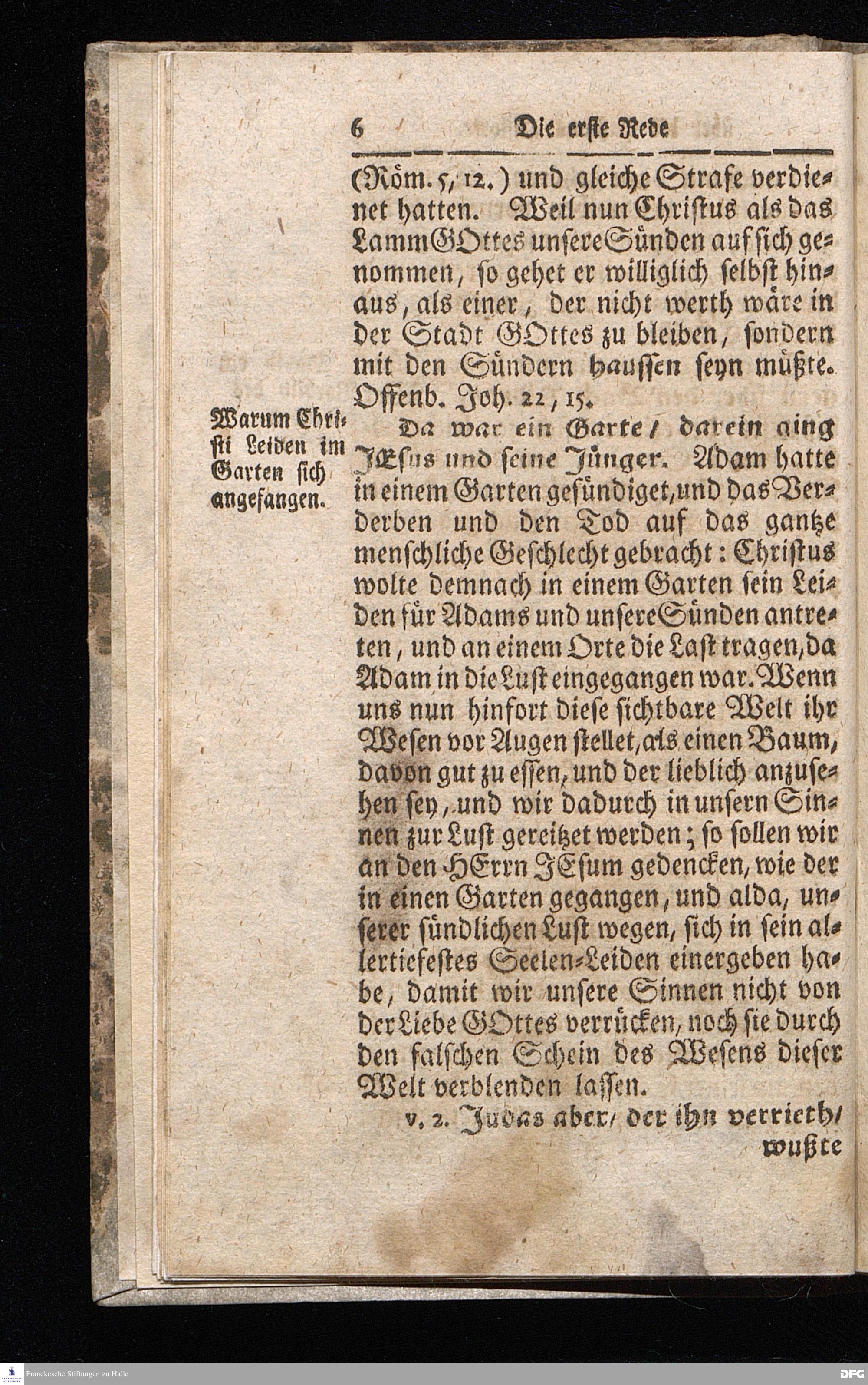 August Hermann Franckens / S.Theol.Prof.& Past.zu S.Ulrich und des Gymnasii Scholarchæ, Oeffentliche Reden über die Paßions=Historie / Wie dieselbe vom Evangelisten Johanne im 18.u.19. Cap. beschrieben ist / gehalten Von Esto mihi bis Ostern 1716. In dem Wäysenhause zu Glaucha an Halle. EDITIO II. HALLE / Gedruckt und verlegt im Wäysenhause MDCCXIX.
