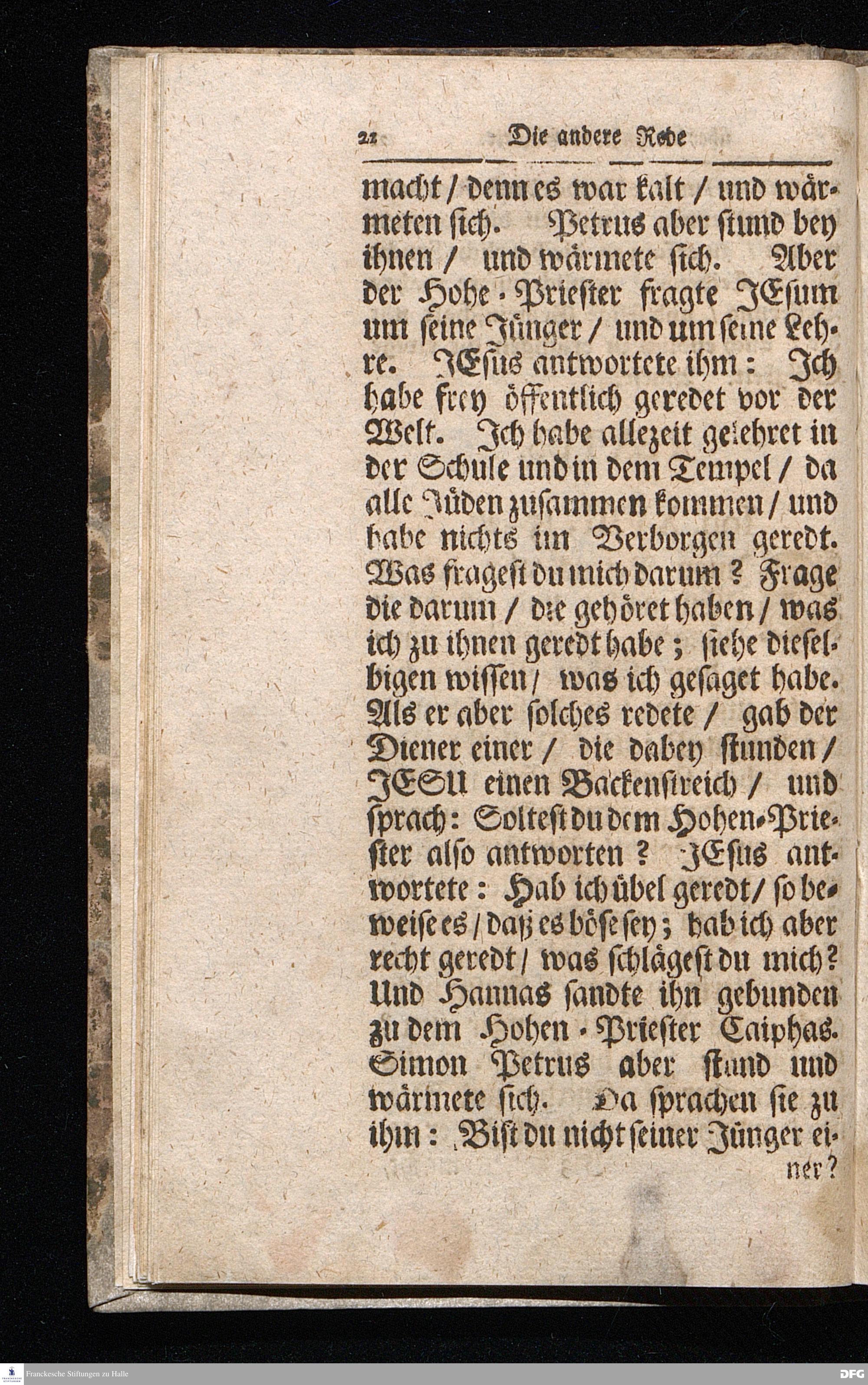 August Hermann Franckens / S.Theol.Prof.& Past.zu S.Ulrich und des Gymnasii Scholarchæ, Oeffentliche Reden über die Paßions=Historie / Wie dieselbe vom Evangelisten Johanne im 18.u.19. Cap. beschrieben ist / gehalten Von Esto mihi bis Ostern 1716. In dem Wäysenhause zu Glaucha an Halle. EDITIO II. HALLE / Gedruckt und verlegt im Wäysenhause MDCCXIX.