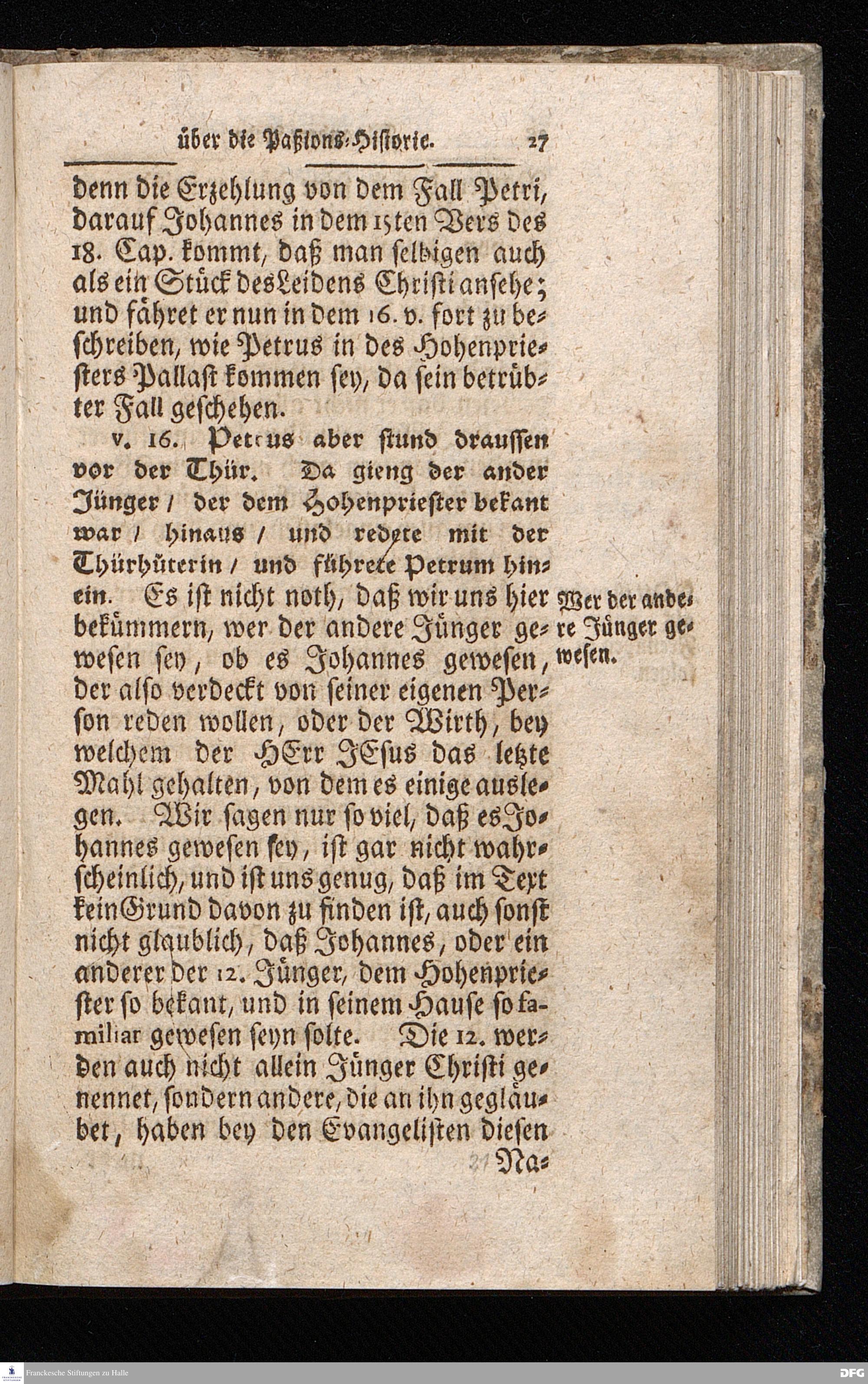 August Hermann Franckens / S.Theol.Prof.& Past.zu S.Ulrich und des Gymnasii Scholarchæ, Oeffentliche Reden über die Paßions=Historie / Wie dieselbe vom Evangelisten Johanne im 18.u.19. Cap. beschrieben ist / gehalten Von Esto mihi bis Ostern 1716. In dem Wäysenhause zu Glaucha an Halle. EDITIO II. HALLE / Gedruckt und verlegt im Wäysenhause MDCCXIX.
