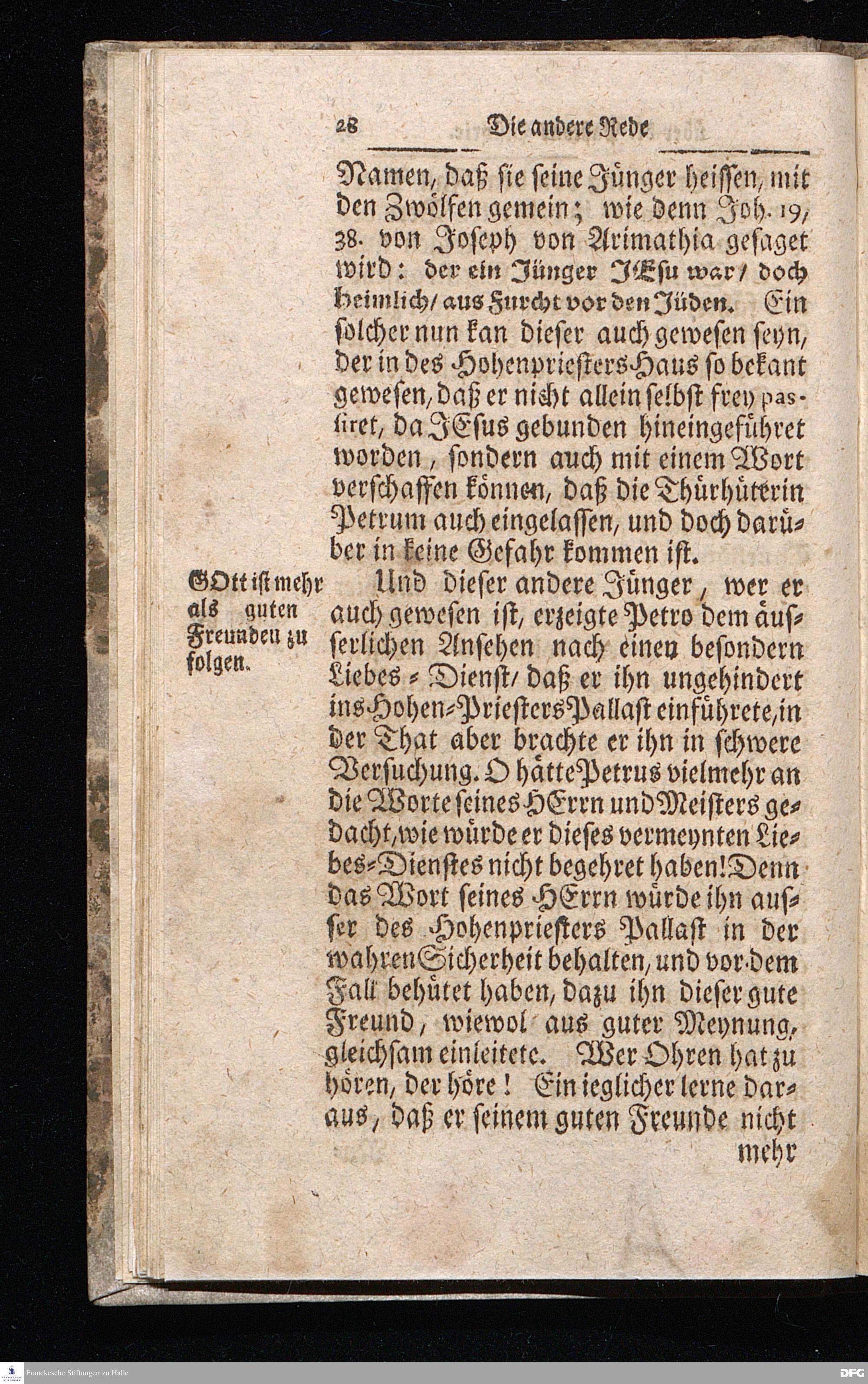 August Hermann Franckens / S.Theol.Prof.& Past.zu S.Ulrich und des Gymnasii Scholarchæ, Oeffentliche Reden über die Paßions=Historie / Wie dieselbe vom Evangelisten Johanne im 18.u.19. Cap. beschrieben ist / gehalten Von Esto mihi bis Ostern 1716. In dem Wäysenhause zu Glaucha an Halle. EDITIO II. HALLE / Gedruckt und verlegt im Wäysenhause MDCCXIX.