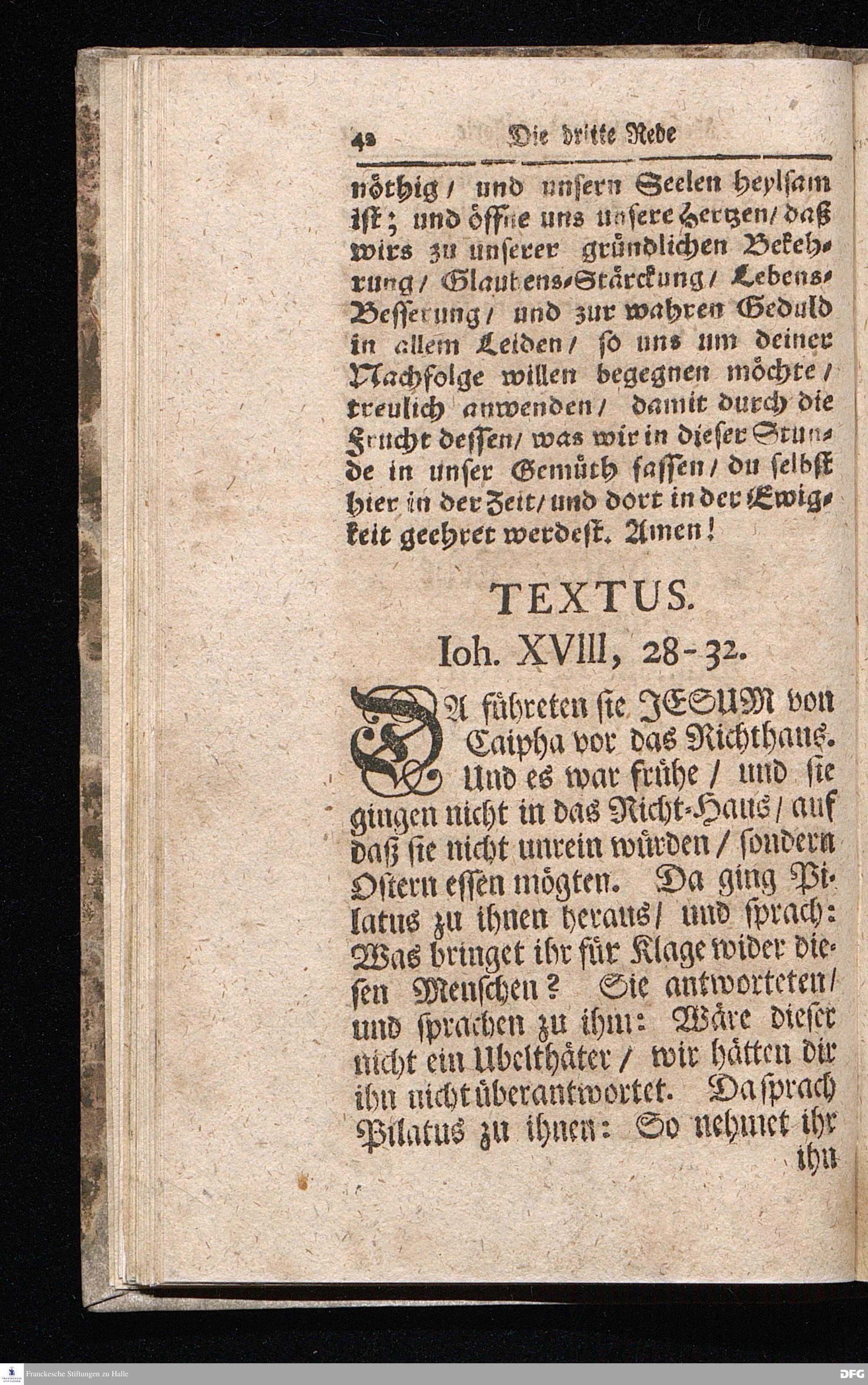 August Hermann Franckens / S.Theol.Prof.& Past.zu S.Ulrich und des Gymnasii Scholarchæ, Oeffentliche Reden über die Paßions=Historie / Wie dieselbe vom Evangelisten Johanne im 18.u.19. Cap. beschrieben ist / gehalten Von Esto mihi bis Ostern 1716. In dem Wäysenhause zu Glaucha an Halle. EDITIO II. HALLE / Gedruckt und verlegt im Wäysenhause MDCCXIX.