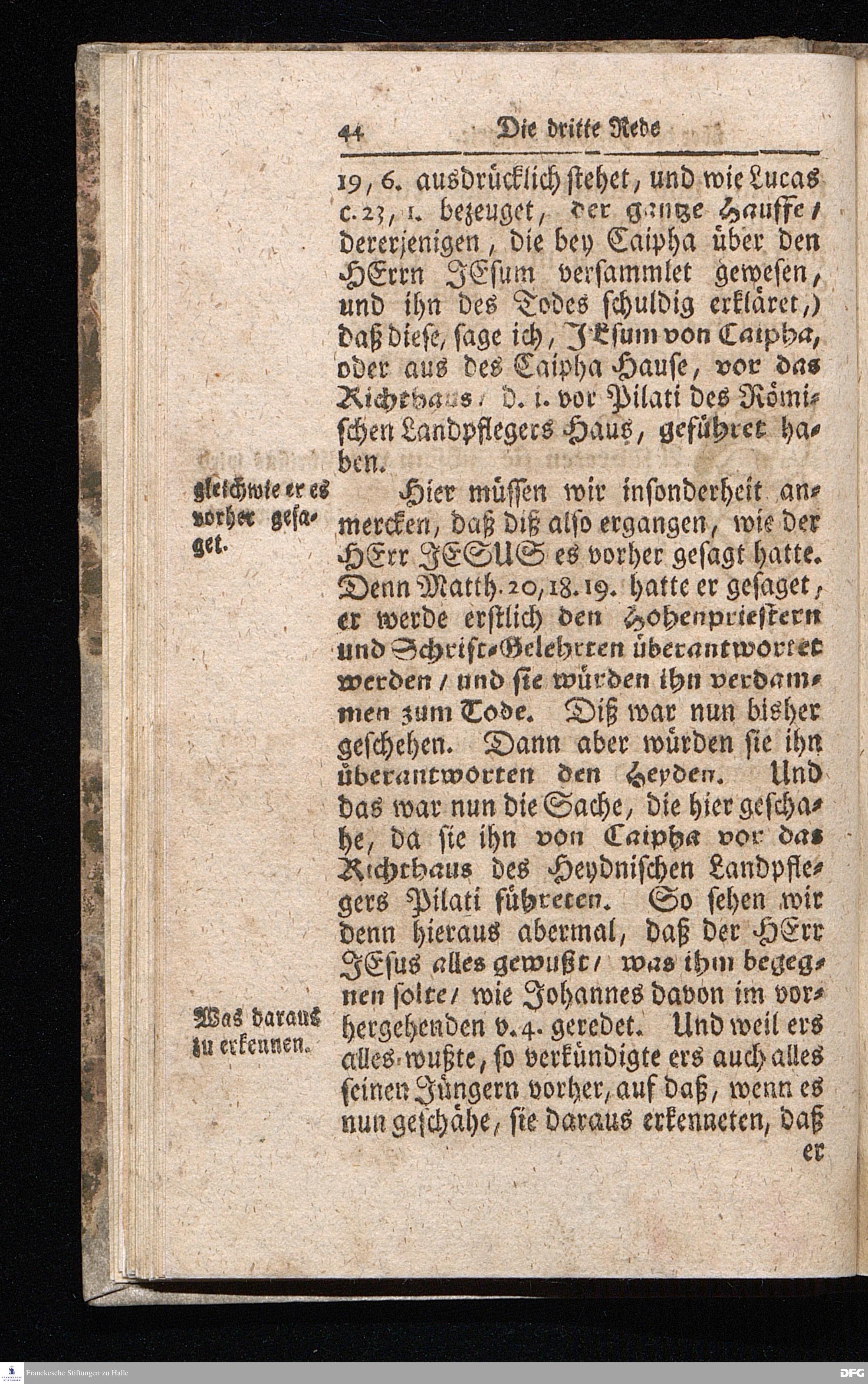 August Hermann Franckens / S.Theol.Prof.& Past.zu S.Ulrich und des Gymnasii Scholarchæ, Oeffentliche Reden über die Paßions=Historie / Wie dieselbe vom Evangelisten Johanne im 18.u.19. Cap. beschrieben ist / gehalten Von Esto mihi bis Ostern 1716. In dem Wäysenhause zu Glaucha an Halle. EDITIO II. HALLE / Gedruckt und verlegt im Wäysenhause MDCCXIX.