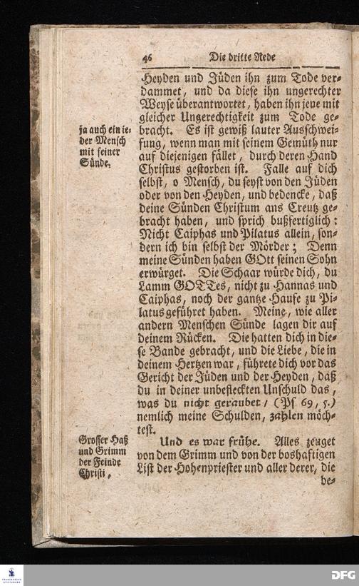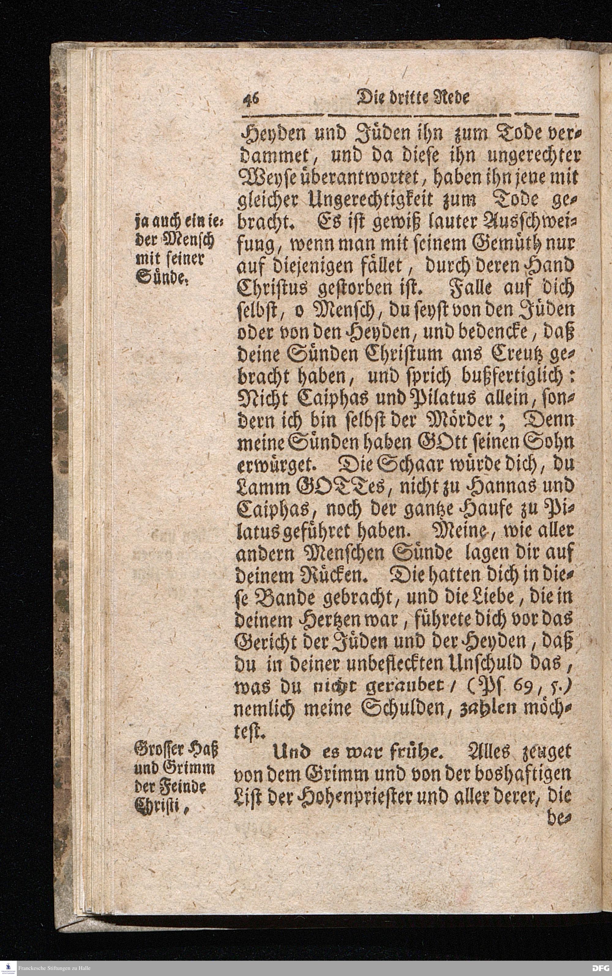 August Hermann Franckens / S.Theol.Prof.& Past.zu S.Ulrich und des Gymnasii Scholarchæ, Oeffentliche Reden über die Paßions=Historie / Wie dieselbe vom Evangelisten Johanne im 18.u.19. Cap. beschrieben ist / gehalten Von Esto mihi bis Ostern 1716. In dem Wäysenhause zu Glaucha an Halle. EDITIO II. HALLE / Gedruckt und verlegt im Wäysenhause MDCCXIX.