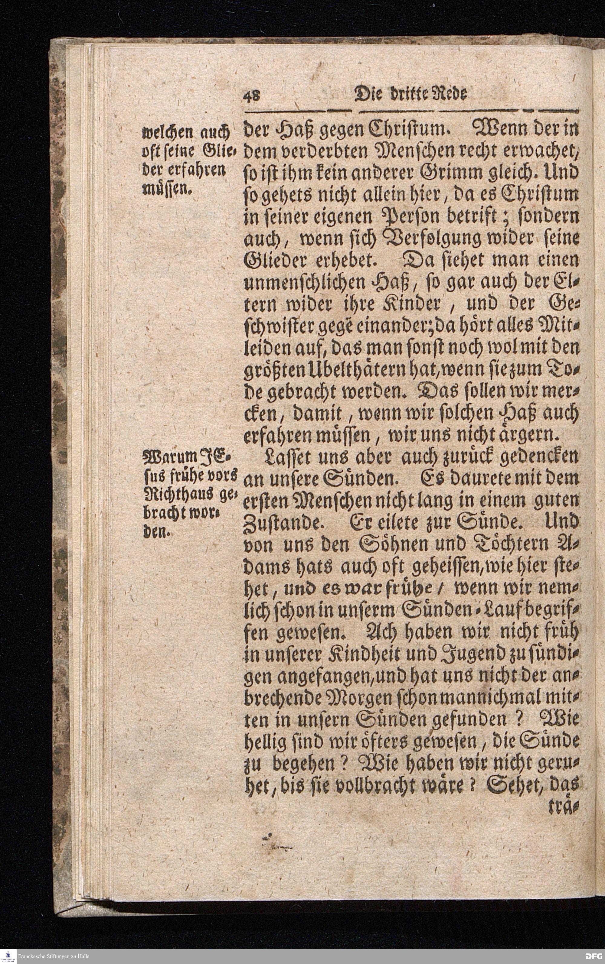 August Hermann Franckens / S.Theol.Prof.& Past.zu S.Ulrich und des Gymnasii Scholarchæ, Oeffentliche Reden über die Paßions=Historie / Wie dieselbe vom Evangelisten Johanne im 18.u.19. Cap. beschrieben ist / gehalten Von Esto mihi bis Ostern 1716. In dem Wäysenhause zu Glaucha an Halle. EDITIO II. HALLE / Gedruckt und verlegt im Wäysenhause MDCCXIX.
