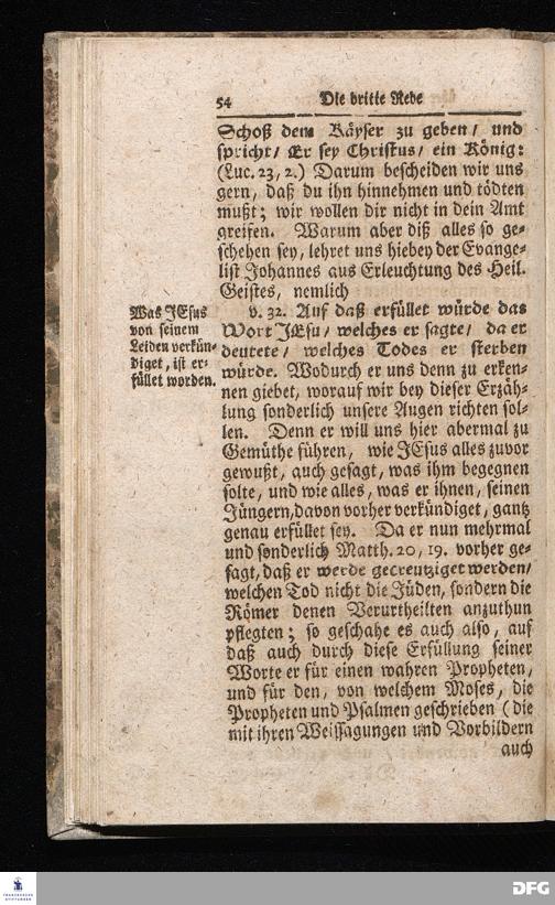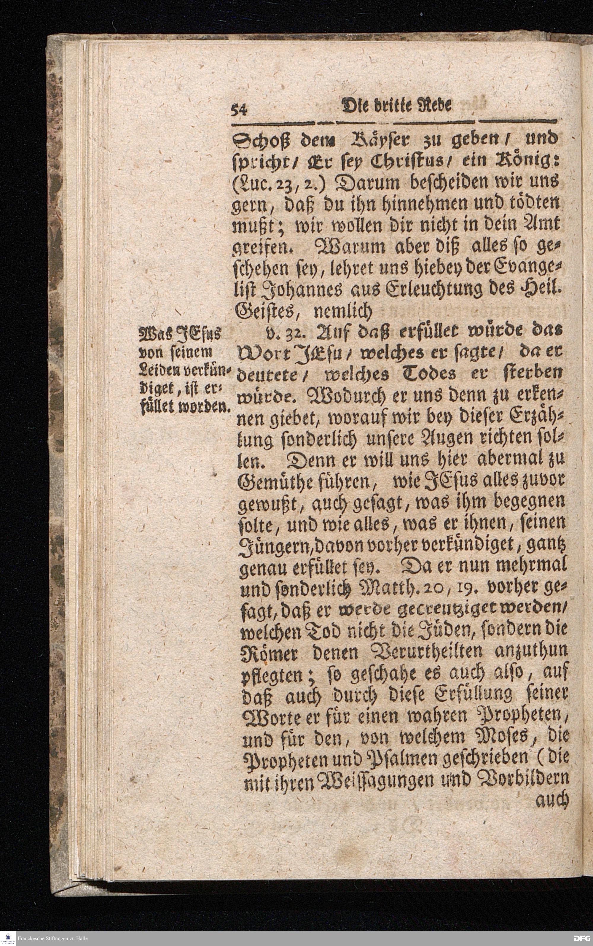 August Hermann Franckens / S.Theol.Prof.& Past.zu S.Ulrich und des Gymnasii Scholarchæ, Oeffentliche Reden über die Paßions=Historie / Wie dieselbe vom Evangelisten Johanne im 18.u.19. Cap. beschrieben ist / gehalten Von Esto mihi bis Ostern 1716. In dem Wäysenhause zu Glaucha an Halle. EDITIO II. HALLE / Gedruckt und verlegt im Wäysenhause MDCCXIX.