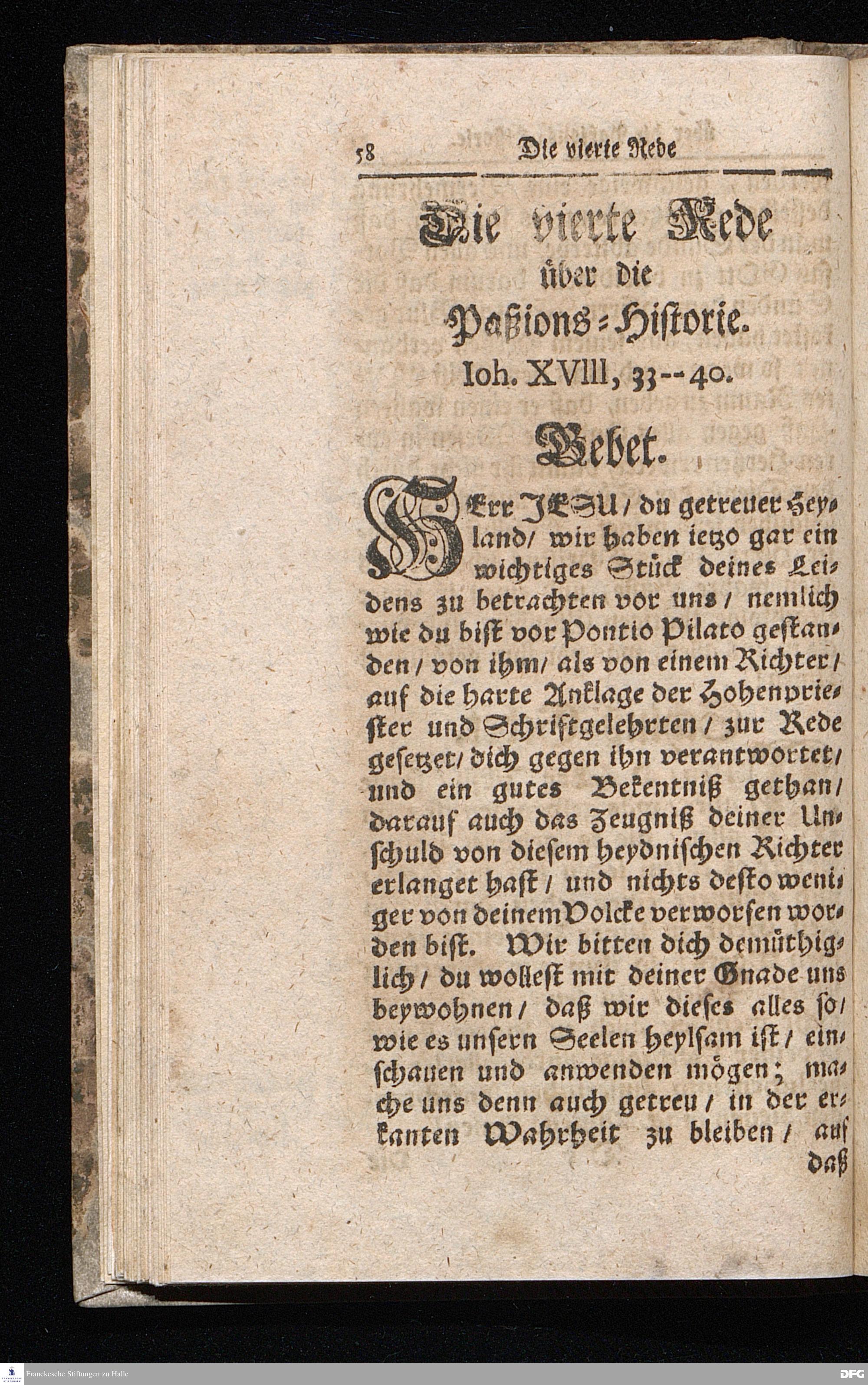 August Hermann Franckens / S.Theol.Prof.& Past.zu S.Ulrich und des Gymnasii Scholarchæ, Oeffentliche Reden über die Paßions=Historie / Wie dieselbe vom Evangelisten Johanne im 18.u.19. Cap. beschrieben ist / gehalten Von Esto mihi bis Ostern 1716. In dem Wäysenhause zu Glaucha an Halle. EDITIO II. HALLE / Gedruckt und verlegt im Wäysenhause MDCCXIX.