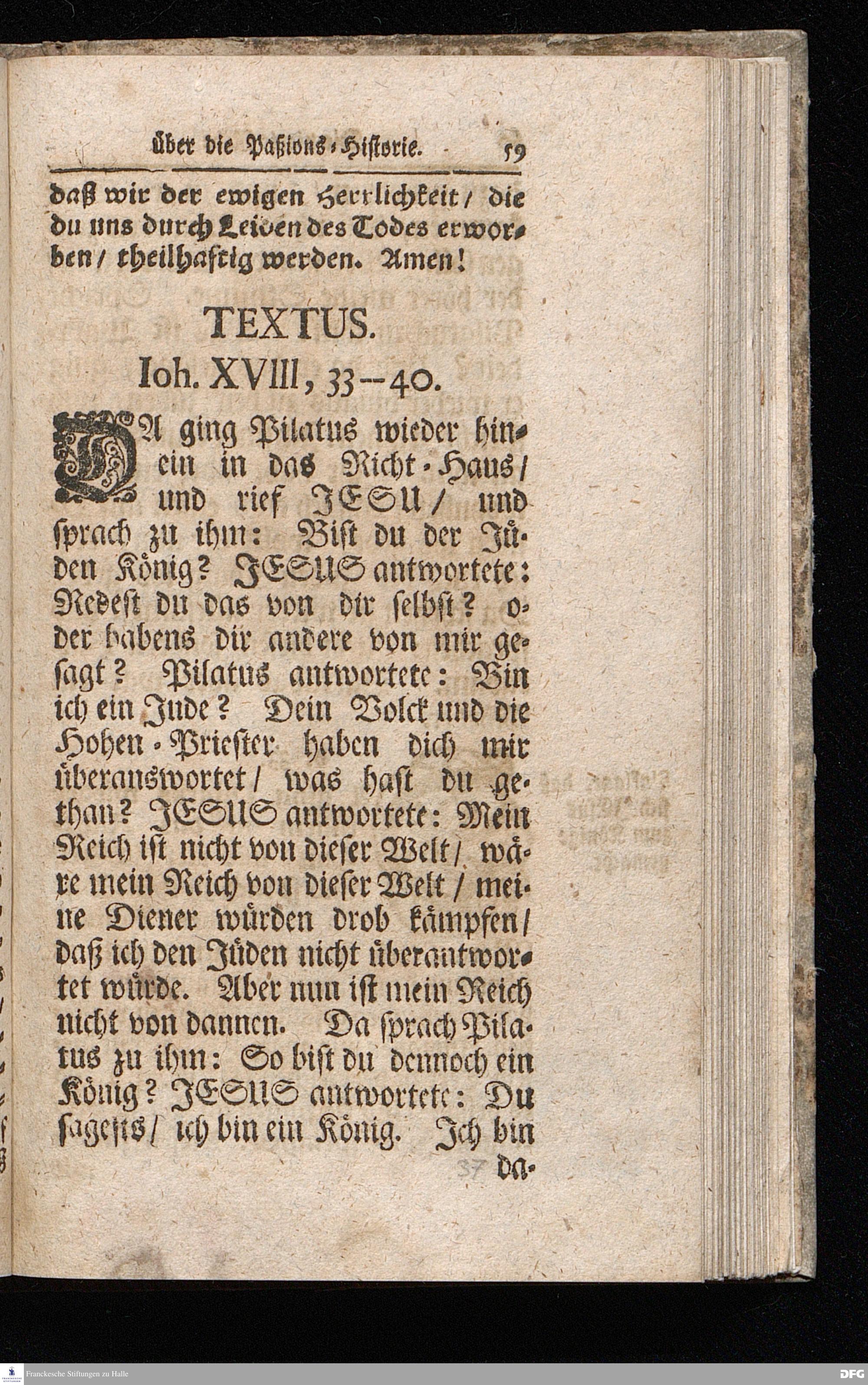 August Hermann Franckens / S.Theol.Prof.& Past.zu S.Ulrich und des Gymnasii Scholarchæ, Oeffentliche Reden über die Paßions=Historie / Wie dieselbe vom Evangelisten Johanne im 18.u.19. Cap. beschrieben ist / gehalten Von Esto mihi bis Ostern 1716. In dem Wäysenhause zu Glaucha an Halle. EDITIO II. HALLE / Gedruckt und verlegt im Wäysenhause MDCCXIX.