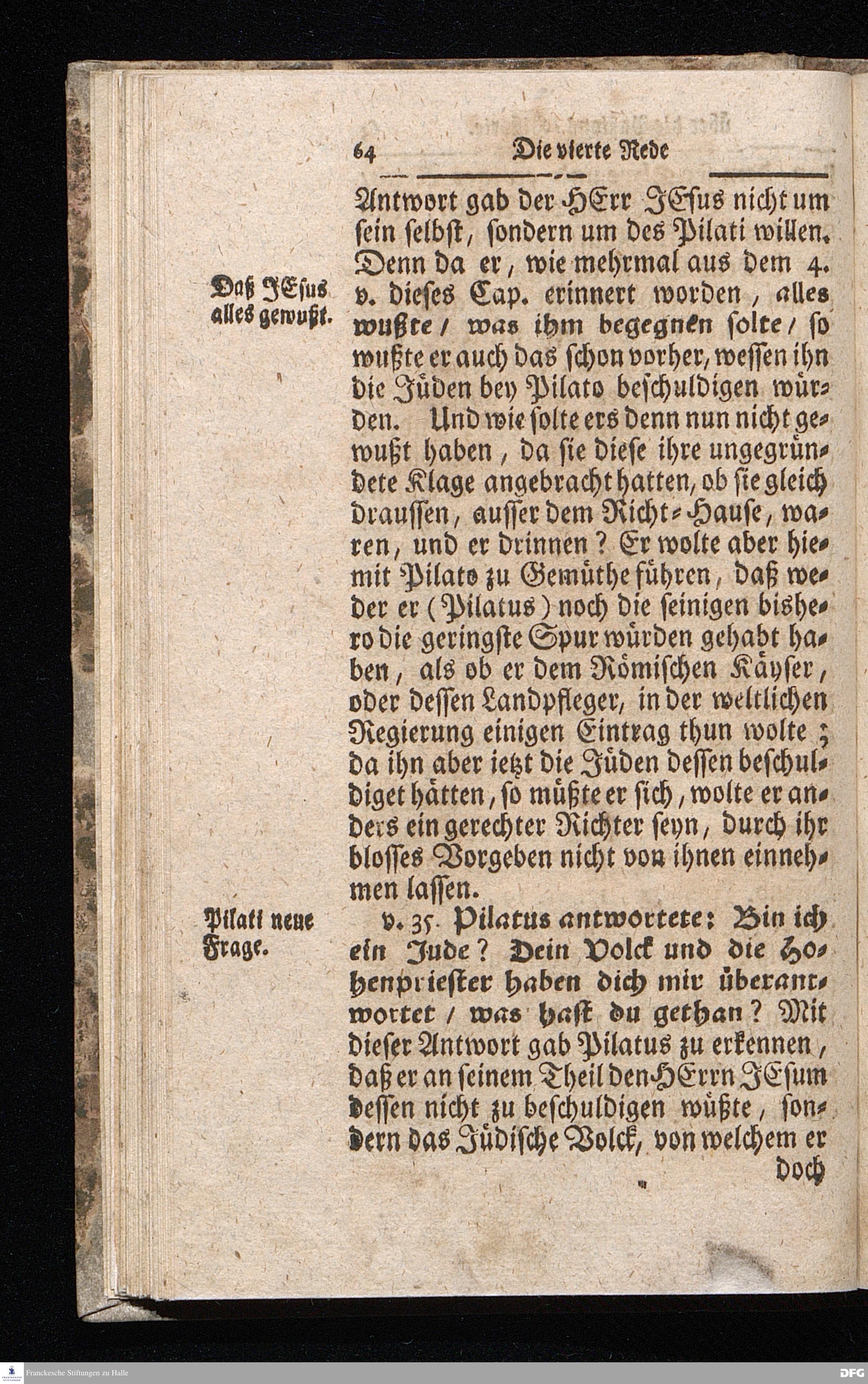 August Hermann Franckens / S.Theol.Prof.& Past.zu S.Ulrich und des Gymnasii Scholarchæ, Oeffentliche Reden über die Paßions=Historie / Wie dieselbe vom Evangelisten Johanne im 18.u.19. Cap. beschrieben ist / gehalten Von Esto mihi bis Ostern 1716. In dem Wäysenhause zu Glaucha an Halle. EDITIO II. HALLE / Gedruckt und verlegt im Wäysenhause MDCCXIX.