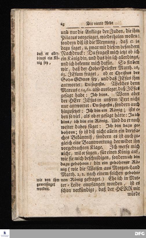 August Hermann Franckens / S.Theol.Prof.& Past.zu S.Ulrich und des Gymnasii Scholarchæ, Oeffentliche Reden über die Paßions=Historie / Wie dieselbe vom Evangelisten Johanne im 18.u.19. Cap. beschrieben ist / gehalten Von Esto mihi bis Ostern 1716. In dem Wäysenhause zu Glaucha an Halle. EDITIO II. HALLE / Gedruckt und verlegt im Wäysenhause MDCCXIX.