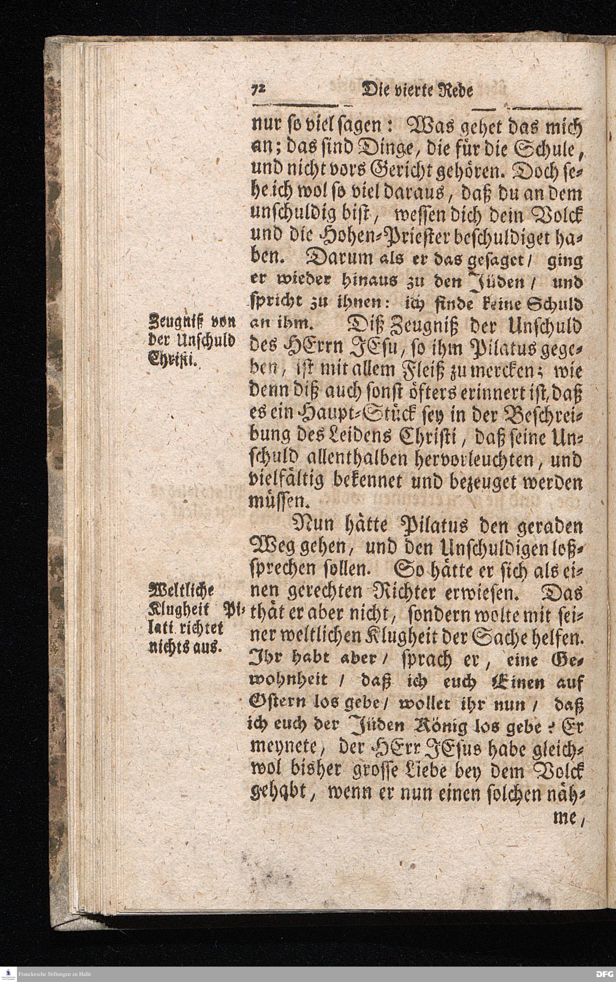 August Hermann Franckens / S.Theol.Prof.& Past.zu S.Ulrich und des Gymnasii Scholarchæ, Oeffentliche Reden über die Paßions=Historie / Wie dieselbe vom Evangelisten Johanne im 18.u.19. Cap. beschrieben ist / gehalten Von Esto mihi bis Ostern 1716. In dem Wäysenhause zu Glaucha an Halle. EDITIO II. HALLE / Gedruckt und verlegt im Wäysenhause MDCCXIX.