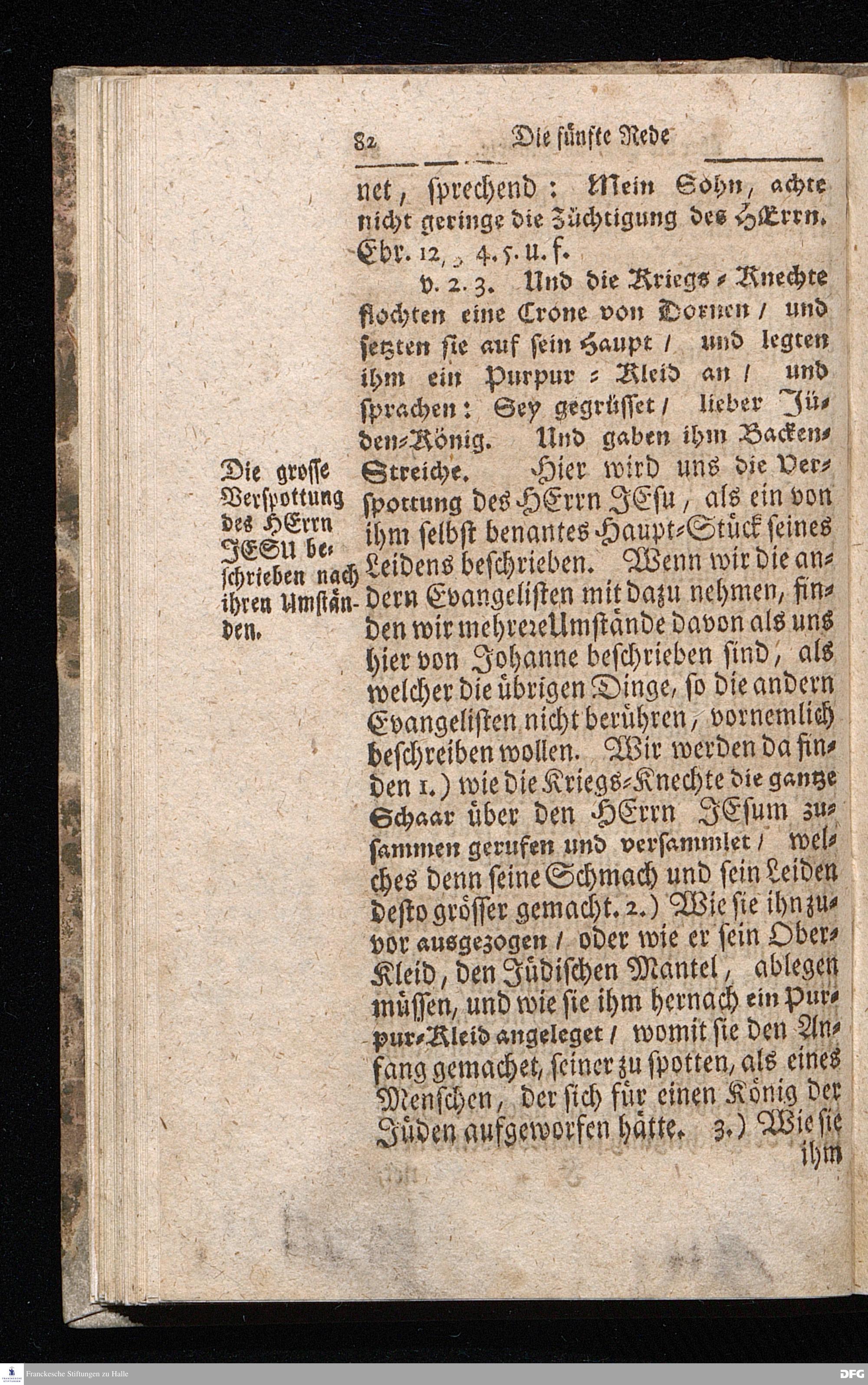 August Hermann Franckens / S.Theol.Prof.& Past.zu S.Ulrich und des Gymnasii Scholarchæ, Oeffentliche Reden über die Paßions=Historie / Wie dieselbe vom Evangelisten Johanne im 18.u.19. Cap. beschrieben ist / gehalten Von Esto mihi bis Ostern 1716. In dem Wäysenhause zu Glaucha an Halle. EDITIO II. HALLE / Gedruckt und verlegt im Wäysenhause MDCCXIX.