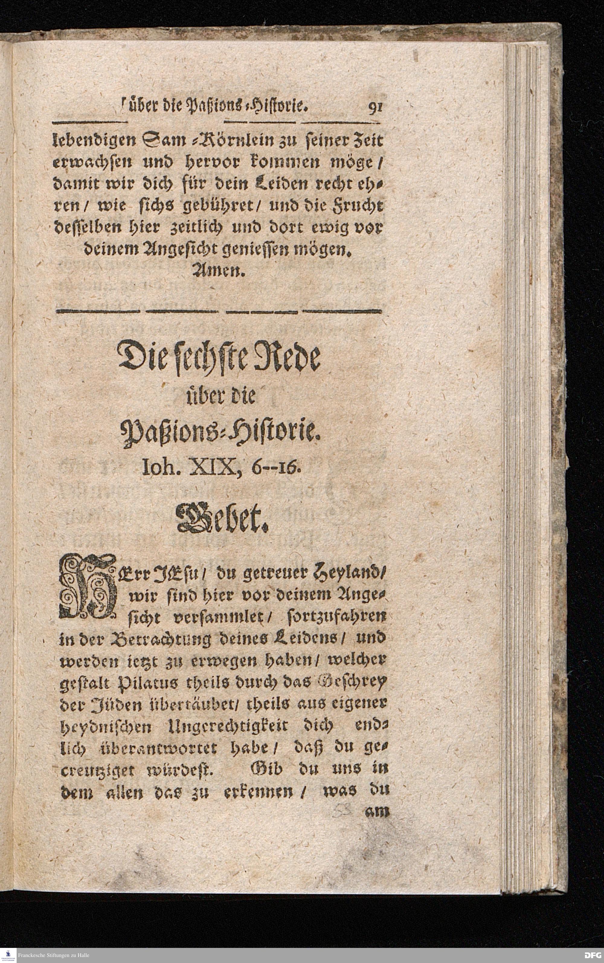 August Hermann Franckens / S.Theol.Prof.& Past.zu S.Ulrich und des Gymnasii Scholarchæ, Oeffentliche Reden über die Paßions=Historie / Wie dieselbe vom Evangelisten Johanne im 18.u.19. Cap. beschrieben ist / gehalten Von Esto mihi bis Ostern 1716. In dem Wäysenhause zu Glaucha an Halle. EDITIO II. HALLE / Gedruckt und verlegt im Wäysenhause MDCCXIX.