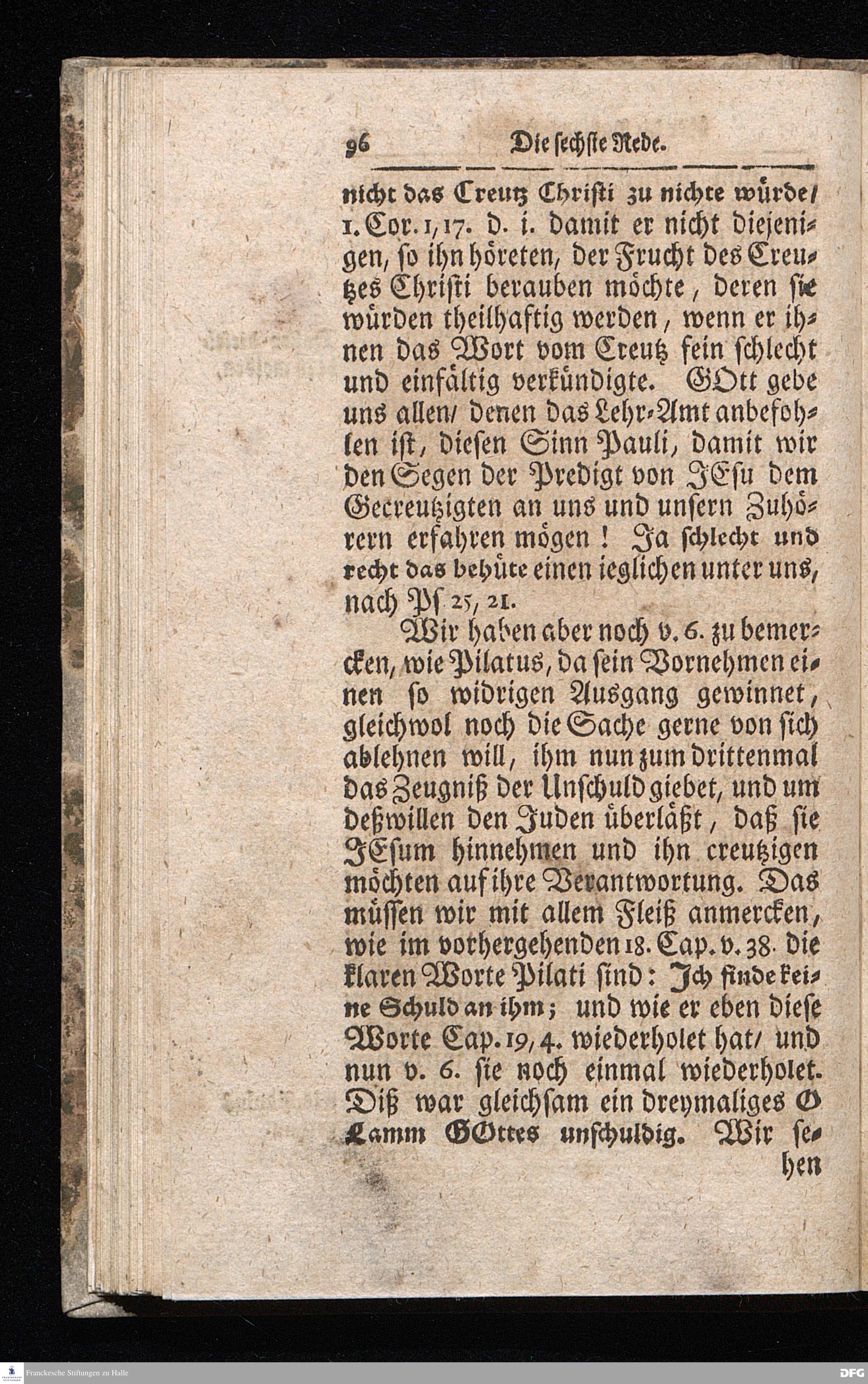 August Hermann Franckens / S.Theol.Prof.& Past.zu S.Ulrich und des Gymnasii Scholarchæ, Oeffentliche Reden über die Paßions=Historie / Wie dieselbe vom Evangelisten Johanne im 18.u.19. Cap. beschrieben ist / gehalten Von Esto mihi bis Ostern 1716. In dem Wäysenhause zu Glaucha an Halle. EDITIO II. HALLE / Gedruckt und verlegt im Wäysenhause MDCCXIX.