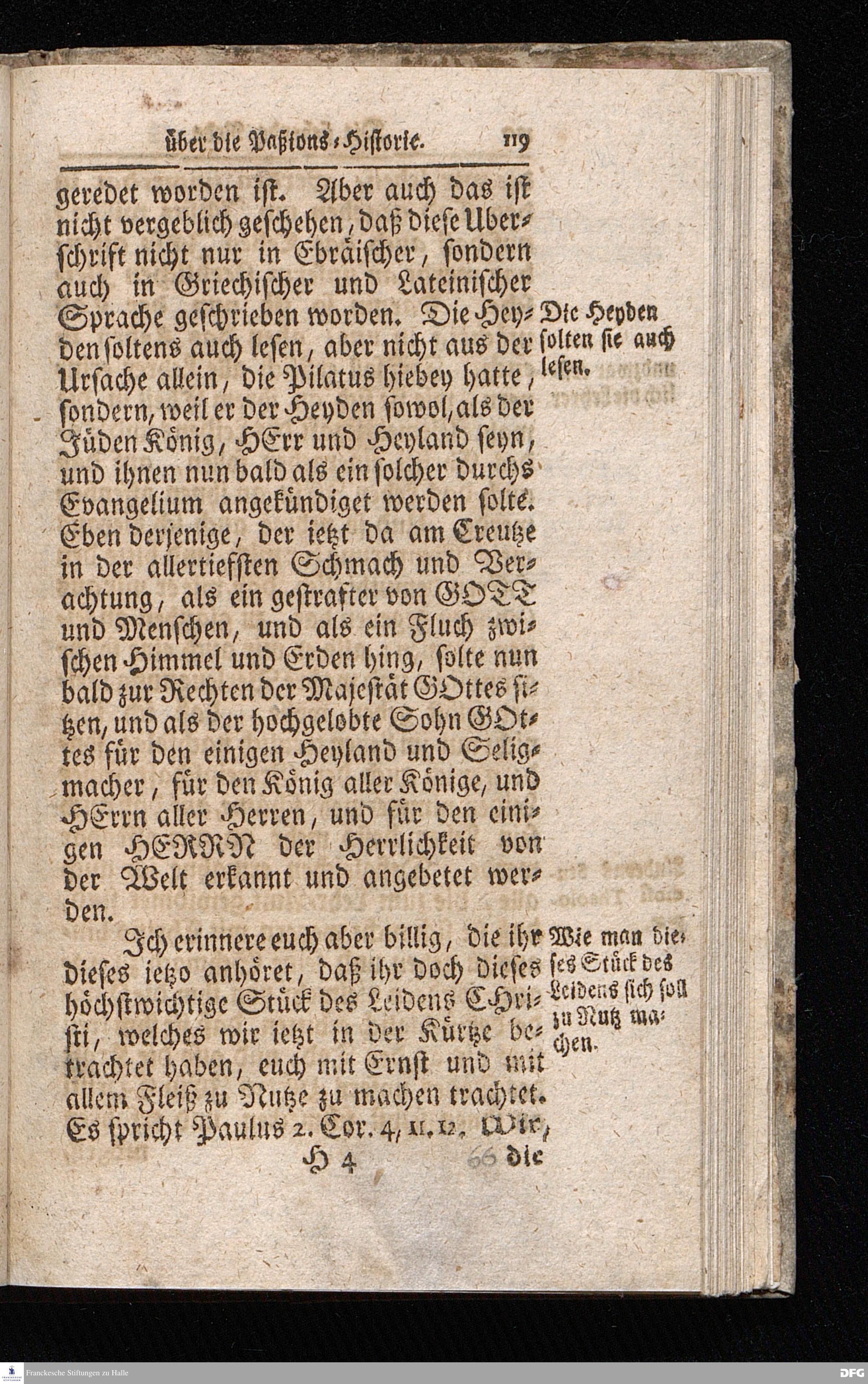 August Hermann Franckens / S.Theol.Prof.& Past.zu S.Ulrich und des Gymnasii Scholarchæ, Oeffentliche Reden über die Paßions=Historie / Wie dieselbe vom Evangelisten Johanne im 18.u.19. Cap. beschrieben ist / gehalten Von Esto mihi bis Ostern 1716. In dem Wäysenhause zu Glaucha an Halle. EDITIO II. HALLE / Gedruckt und verlegt im Wäysenhause MDCCXIX.