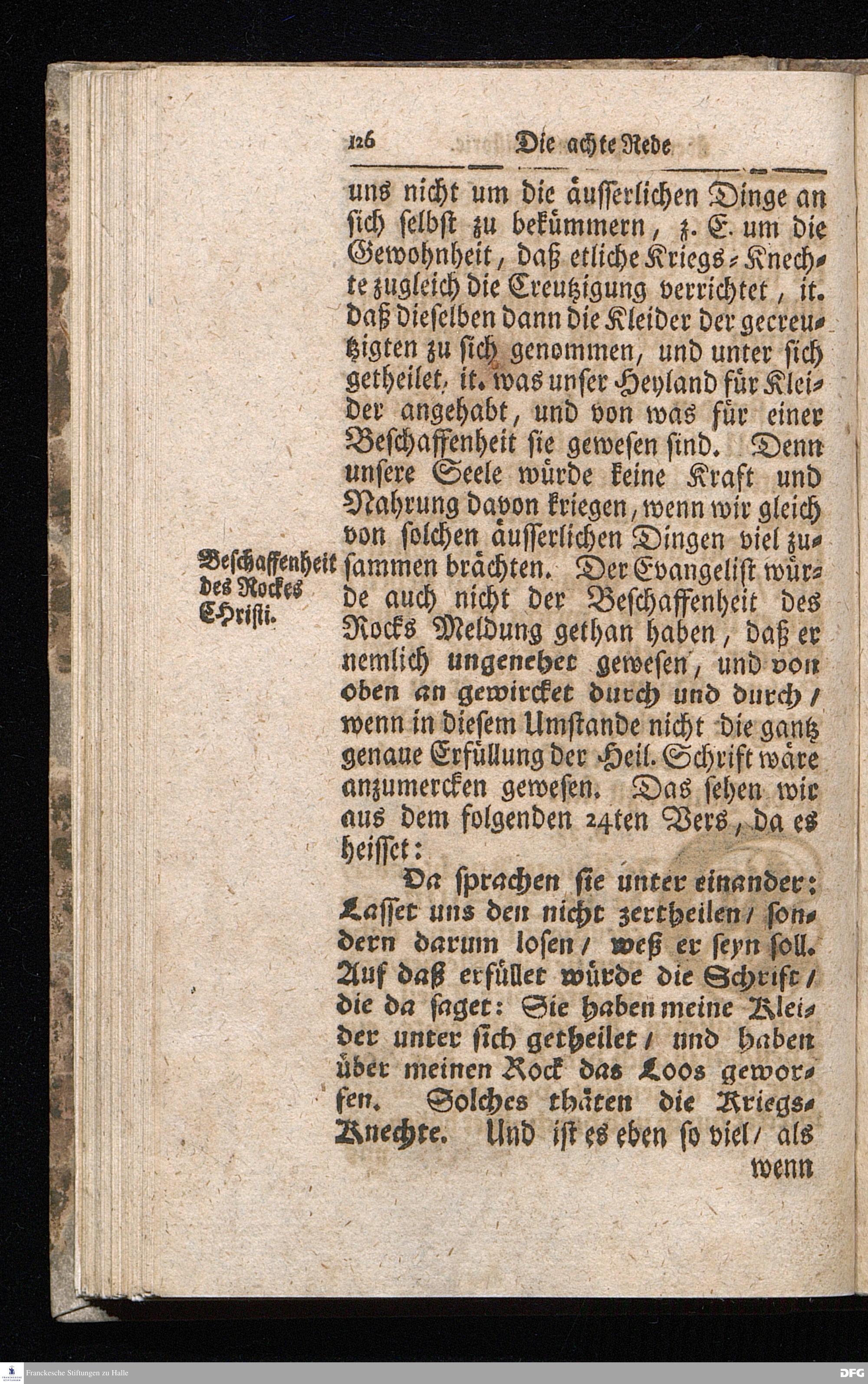August Hermann Franckens / S.Theol.Prof.& Past.zu S.Ulrich und des Gymnasii Scholarchæ, Oeffentliche Reden über die Paßions=Historie / Wie dieselbe vom Evangelisten Johanne im 18.u.19. Cap. beschrieben ist / gehalten Von Esto mihi bis Ostern 1716. In dem Wäysenhause zu Glaucha an Halle. EDITIO II. HALLE / Gedruckt und verlegt im Wäysenhause MDCCXIX.