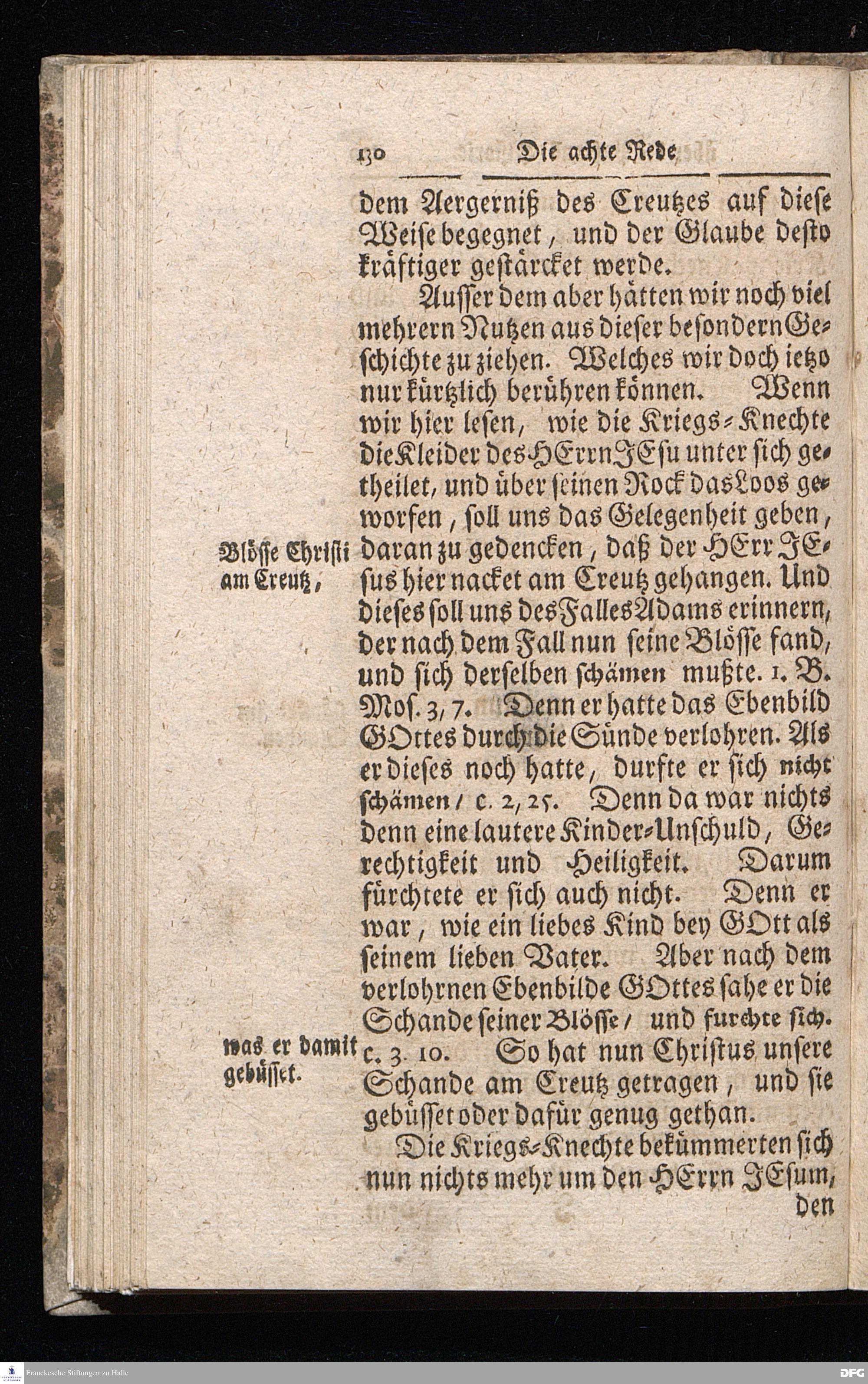 August Hermann Franckens / S.Theol.Prof.& Past.zu S.Ulrich und des Gymnasii Scholarchæ, Oeffentliche Reden über die Paßions=Historie / Wie dieselbe vom Evangelisten Johanne im 18.u.19. Cap. beschrieben ist / gehalten Von Esto mihi bis Ostern 1716. In dem Wäysenhause zu Glaucha an Halle. EDITIO II. HALLE / Gedruckt und verlegt im Wäysenhause MDCCXIX.