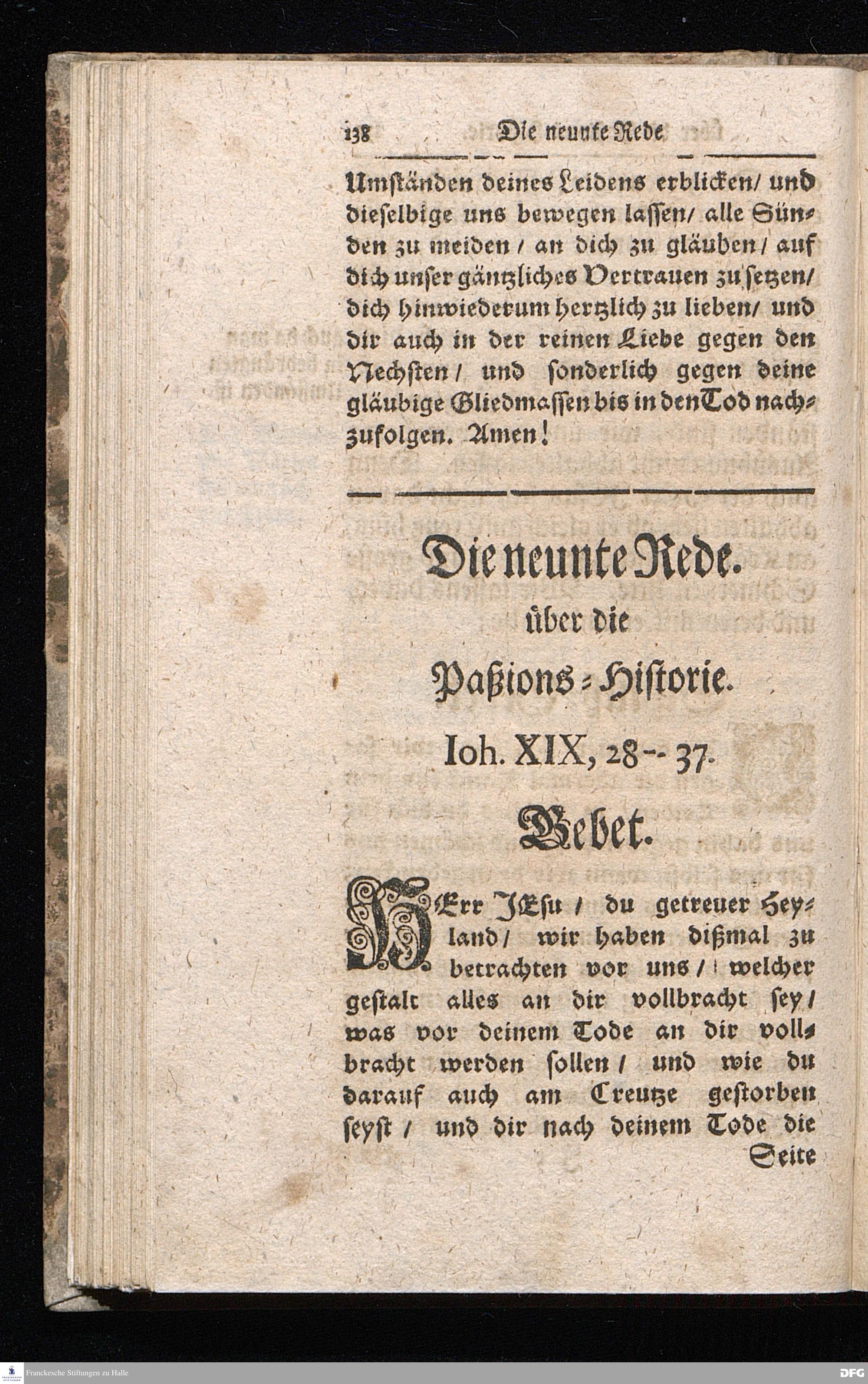 August Hermann Franckens / S.Theol.Prof.& Past.zu S.Ulrich und des Gymnasii Scholarchæ, Oeffentliche Reden über die Paßions=Historie / Wie dieselbe vom Evangelisten Johanne im 18.u.19. Cap. beschrieben ist / gehalten Von Esto mihi bis Ostern 1716. In dem Wäysenhause zu Glaucha an Halle. EDITIO II. HALLE / Gedruckt und verlegt im Wäysenhause MDCCXIX.