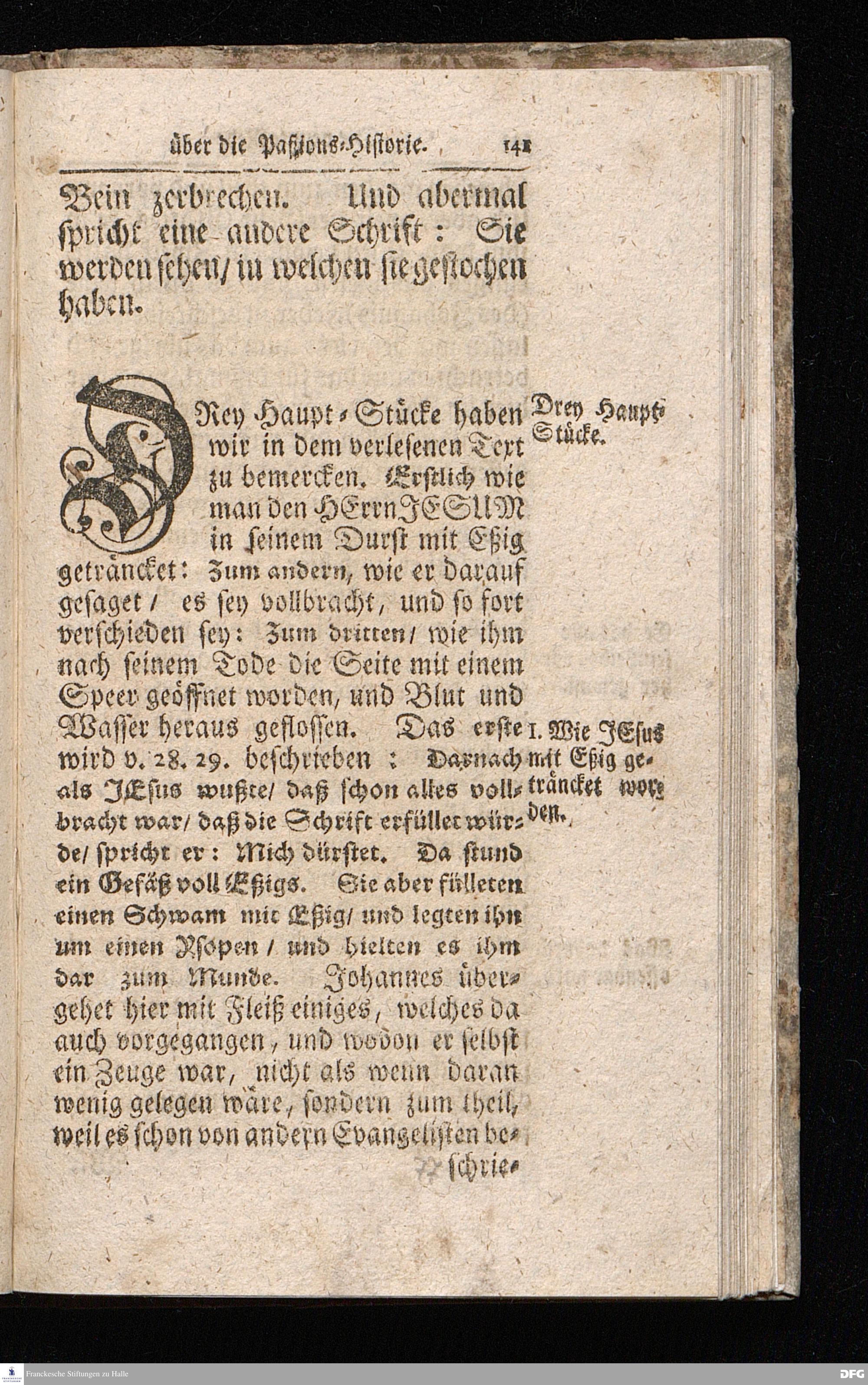August Hermann Franckens / S.Theol.Prof.& Past.zu S.Ulrich und des Gymnasii Scholarchæ, Oeffentliche Reden über die Paßions=Historie / Wie dieselbe vom Evangelisten Johanne im 18.u.19. Cap. beschrieben ist / gehalten Von Esto mihi bis Ostern 1716. In dem Wäysenhause zu Glaucha an Halle. EDITIO II. HALLE / Gedruckt und verlegt im Wäysenhause MDCCXIX.