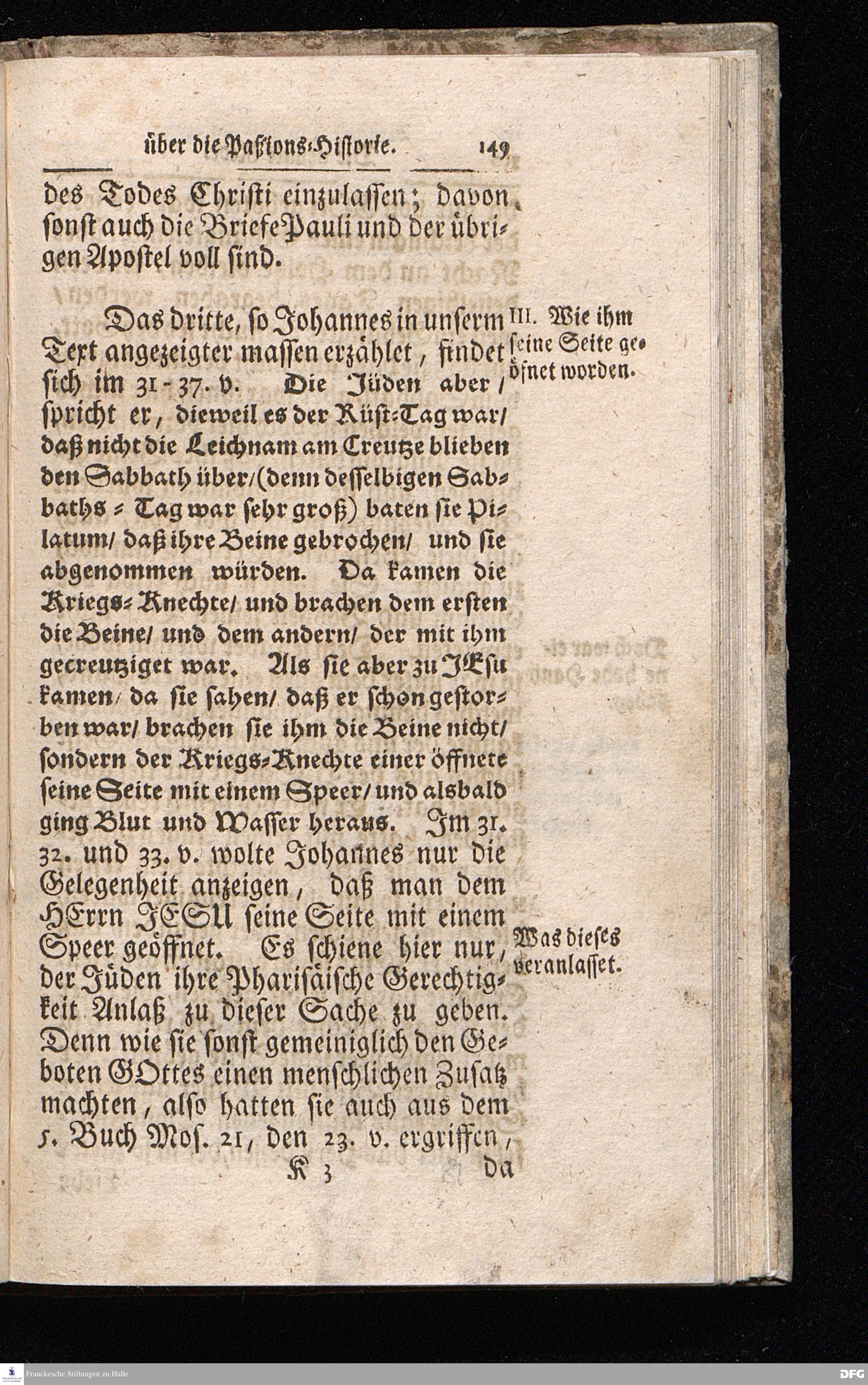 August Hermann Franckens / S.Theol.Prof.& Past.zu S.Ulrich und des Gymnasii Scholarchæ, Oeffentliche Reden über die Paßions=Historie / Wie dieselbe vom Evangelisten Johanne im 18.u.19. Cap. beschrieben ist / gehalten Von Esto mihi bis Ostern 1716. In dem Wäysenhause zu Glaucha an Halle. EDITIO II. HALLE / Gedruckt und verlegt im Wäysenhause MDCCXIX.