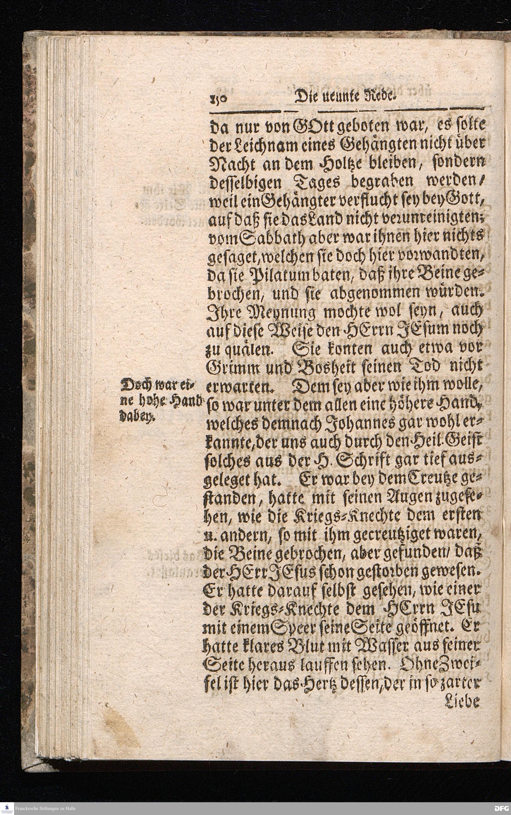 August Hermann Franckens / S.Theol.Prof.& Past.zu S.Ulrich und des Gymnasii Scholarchæ, Oeffentliche Reden über die Paßions=Historie / Wie dieselbe vom Evangelisten Johanne im 18.u.19. Cap. beschrieben ist / gehalten Von Esto mihi bis Ostern 1716. In dem Wäysenhause zu Glaucha an Halle. EDITIO II. HALLE / Gedruckt und verlegt im Wäysenhause MDCCXIX.