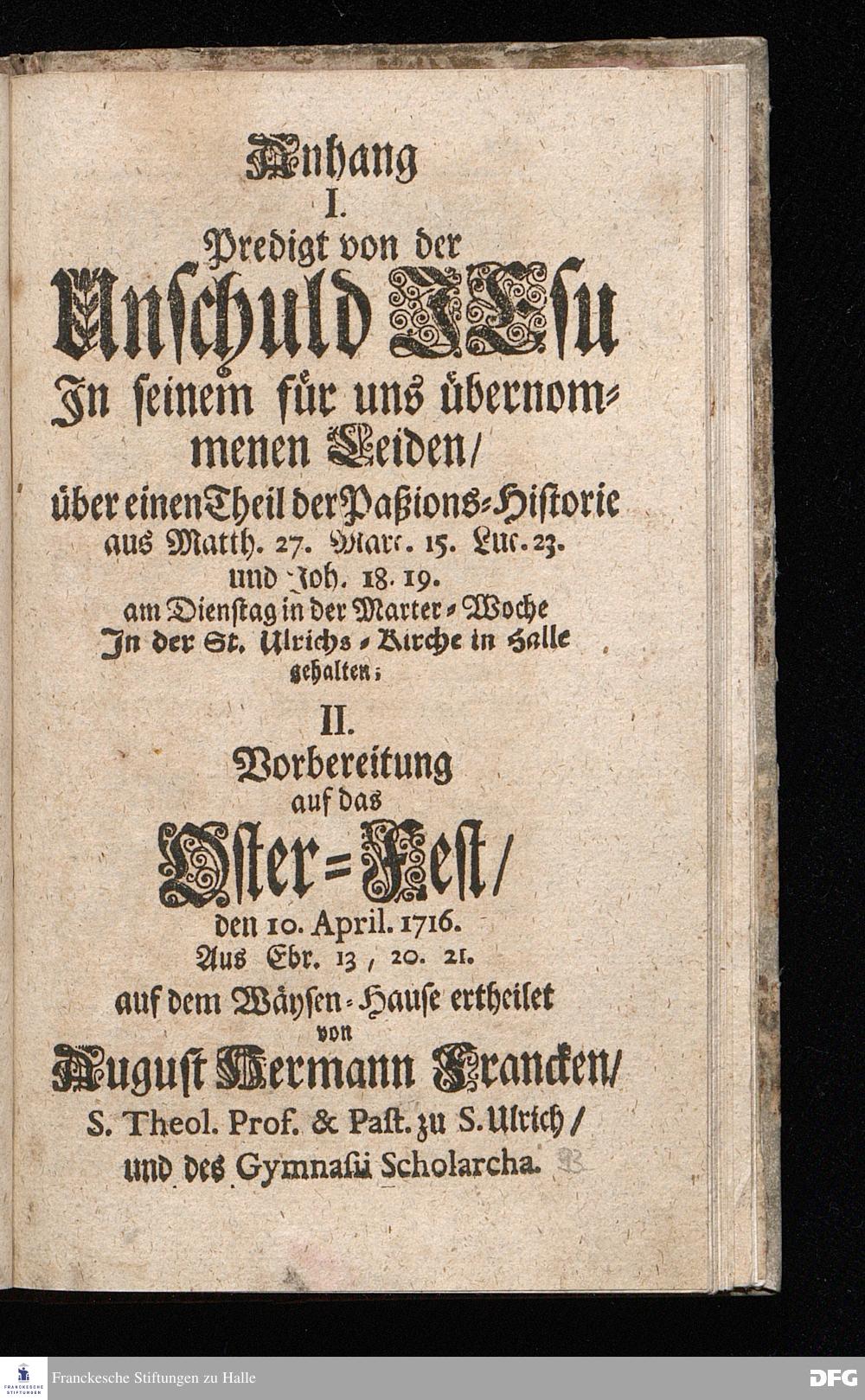 August Hermann Franckens / S.Theol.Prof.& Past.zu S.Ulrich und des Gymnasii Scholarchæ, Oeffentliche Reden über die Paßions=Historie / Wie dieselbe vom Evangelisten Johanne im 18.u.19. Cap. beschrieben ist / gehalten Von Esto mihi bis Ostern 1716. In dem Wäysenhause zu Glaucha an Halle. EDITIO II. HALLE / Gedruckt und verlegt im Wäysenhause MDCCXIX.
