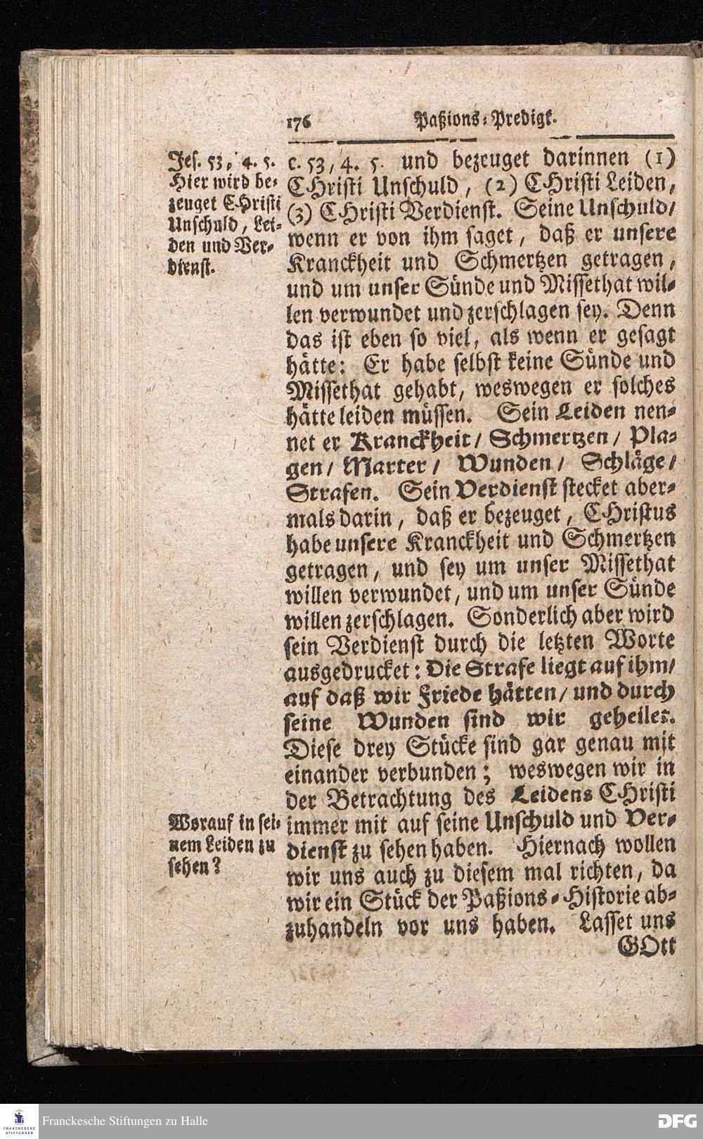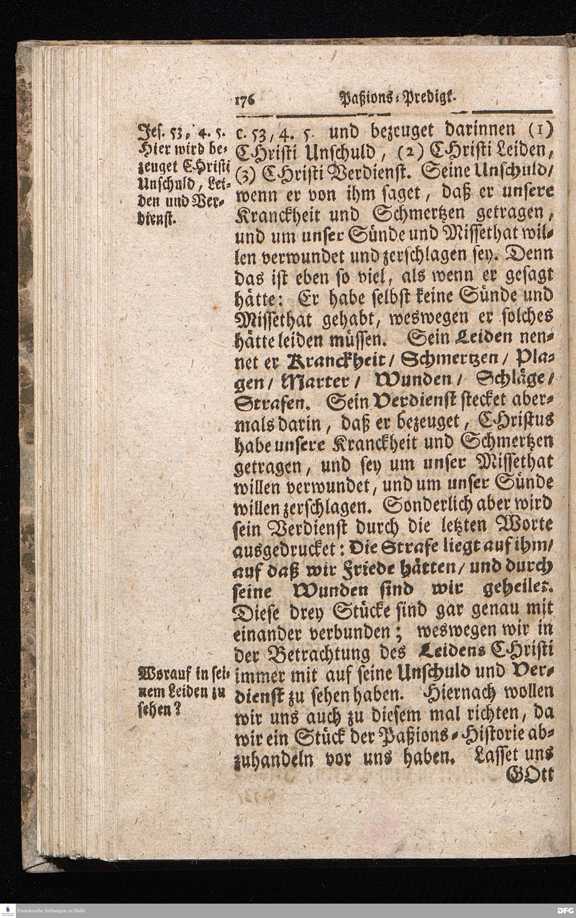 August Hermann Franckens / S.Theol.Prof.& Past.zu S.Ulrich und des Gymnasii Scholarchæ, Oeffentliche Reden über die Paßions=Historie / Wie dieselbe vom Evangelisten Johanne im 18.u.19. Cap. beschrieben ist / gehalten Von Esto mihi bis Ostern 1716. In dem Wäysenhause zu Glaucha an Halle. EDITIO II. HALLE / Gedruckt und verlegt im Wäysenhause MDCCXIX.