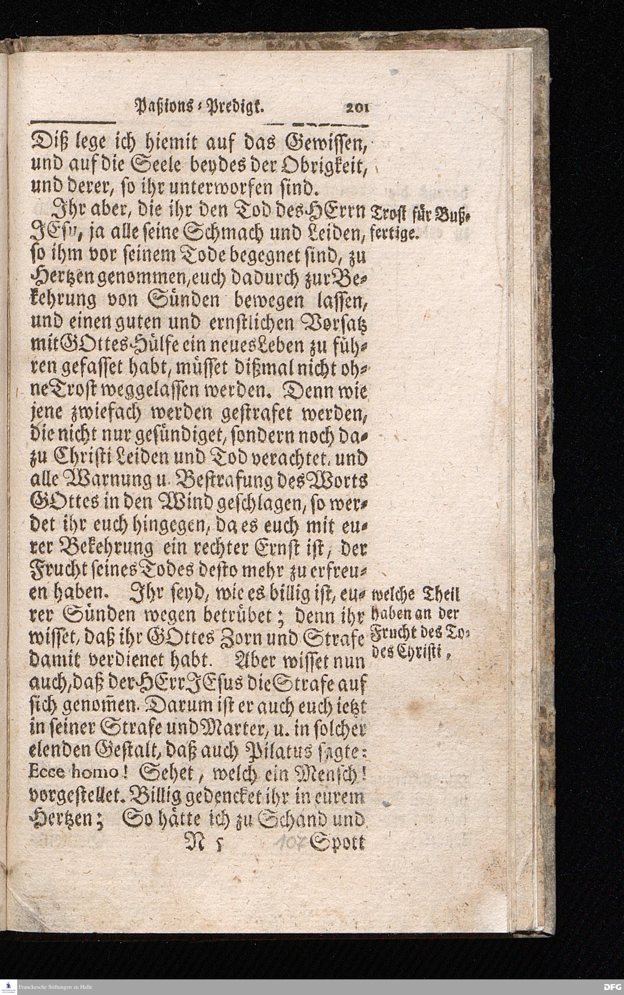August Hermann Franckens / S.Theol.Prof.& Past.zu S.Ulrich und des Gymnasii Scholarchæ, Oeffentliche Reden über die Paßions=Historie / Wie dieselbe vom Evangelisten Johanne im 18.u.19. Cap. beschrieben ist / gehalten Von Esto mihi bis Ostern 1716. In dem Wäysenhause zu Glaucha an Halle. EDITIO II. HALLE / Gedruckt und verlegt im Wäysenhause MDCCXIX.