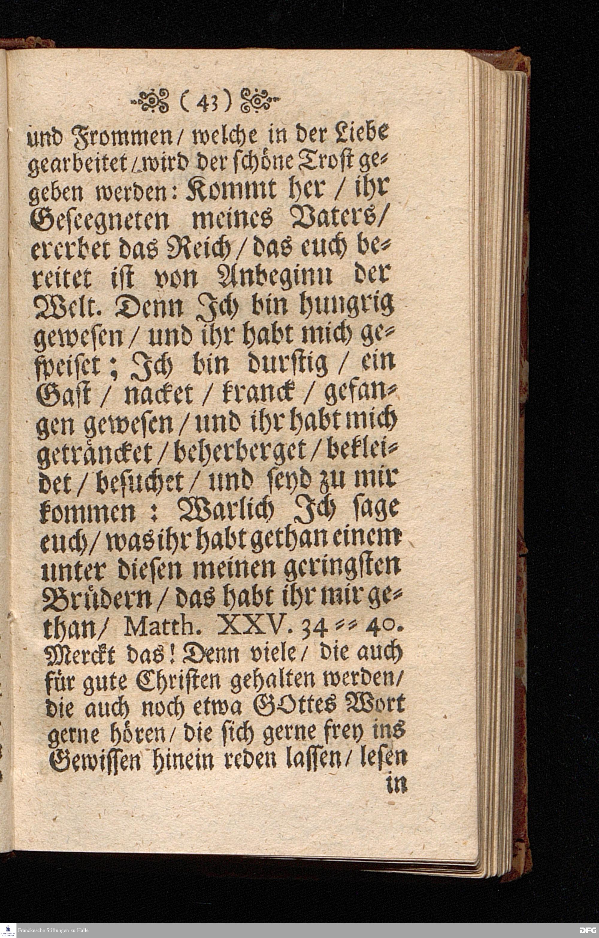 Der Auff kurtze Mühe und Arbeit erfolgende grosse Trost / In einer Predigt Uber das Evangelium Joh.XVI, vers.16==23, Am Sontag JUBILATE Anno 1697. In der St.Georgen=Kirche zu Glaucha an Halle vorgestellet von M.August Hermann Francken / Gr.& OO.LL.P.P.& P.Glauch. HALLE / Druckts Christian Henckel / Univers.Buchdr. J.J.C. 1698.