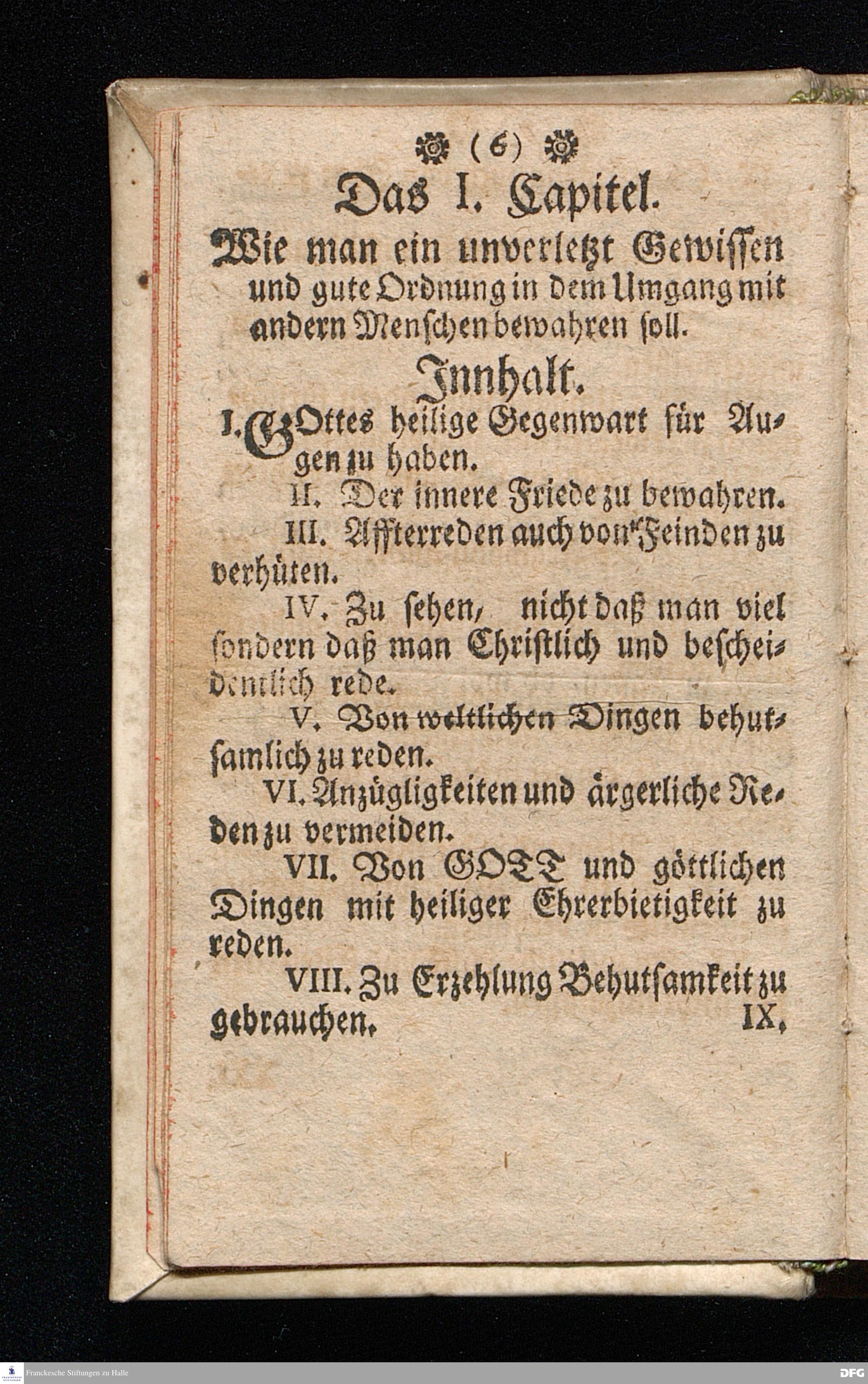 M.August Hermann Franckens Theolog.P.P.& P.Glauch. Schrifftmäßige Lebens-Regeln / Wie man so wohl bey als auch ausser [der] Gesellschafft die Liebe und Freundlichkeit gegen den Nächsten, die Freudigkeit eines guten Gewissens für GOTT bewahren, und im Christenthum zunehmen soll. Zum Siebenden mal auffgeleget. LEIPZIG, Bey Johann Heinichens sel. Witwe. 1717.
