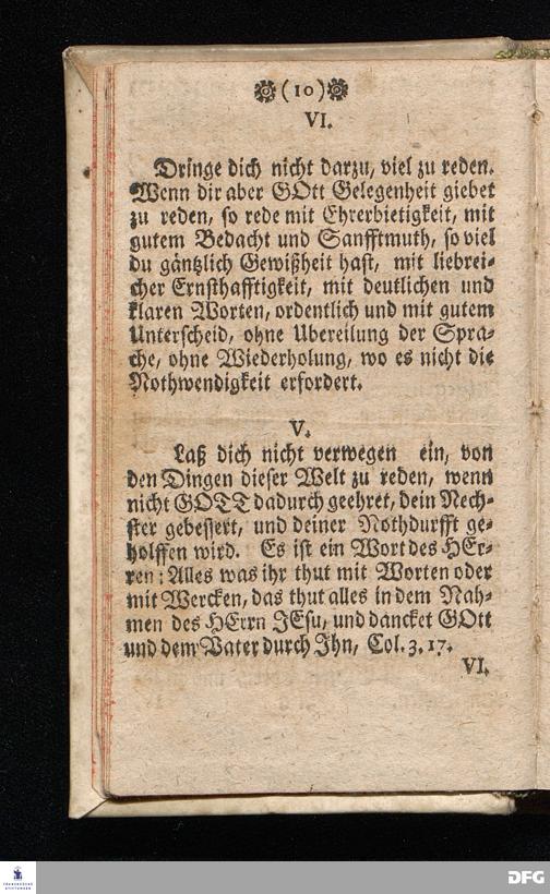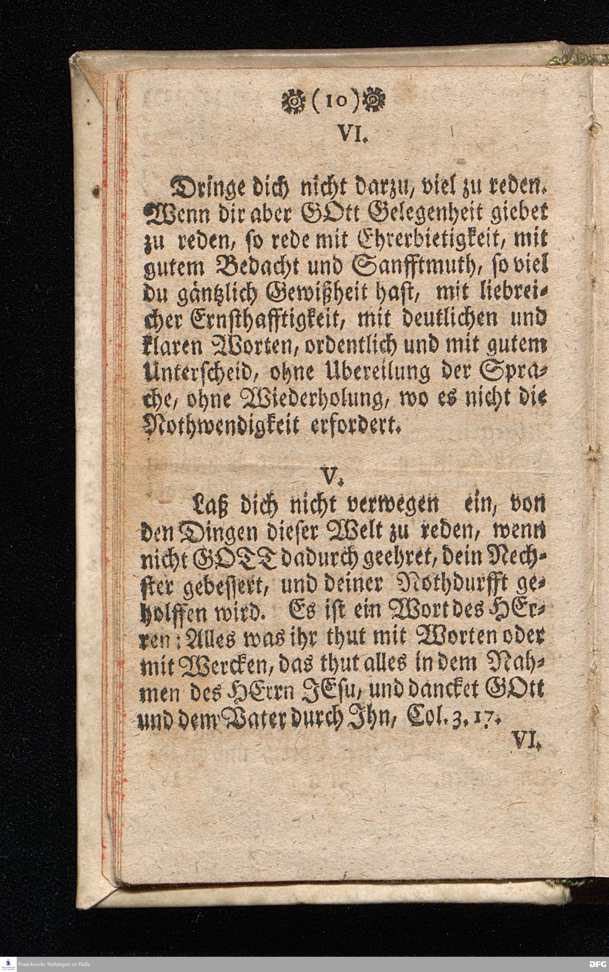 M.August Hermann Franckens Theolog.P.P.& P.Glauch. Schrifftmäßige Lebens-Regeln / Wie man so wohl bey als auch ausser [der] Gesellschafft die Liebe und Freundlichkeit gegen den Nächsten, die Freudigkeit eines guten Gewissens für GOTT bewahren, und im Christenthum zunehmen soll. Zum Siebenden mal auffgeleget. LEIPZIG, Bey Johann Heinichens sel. Witwe. 1717.
