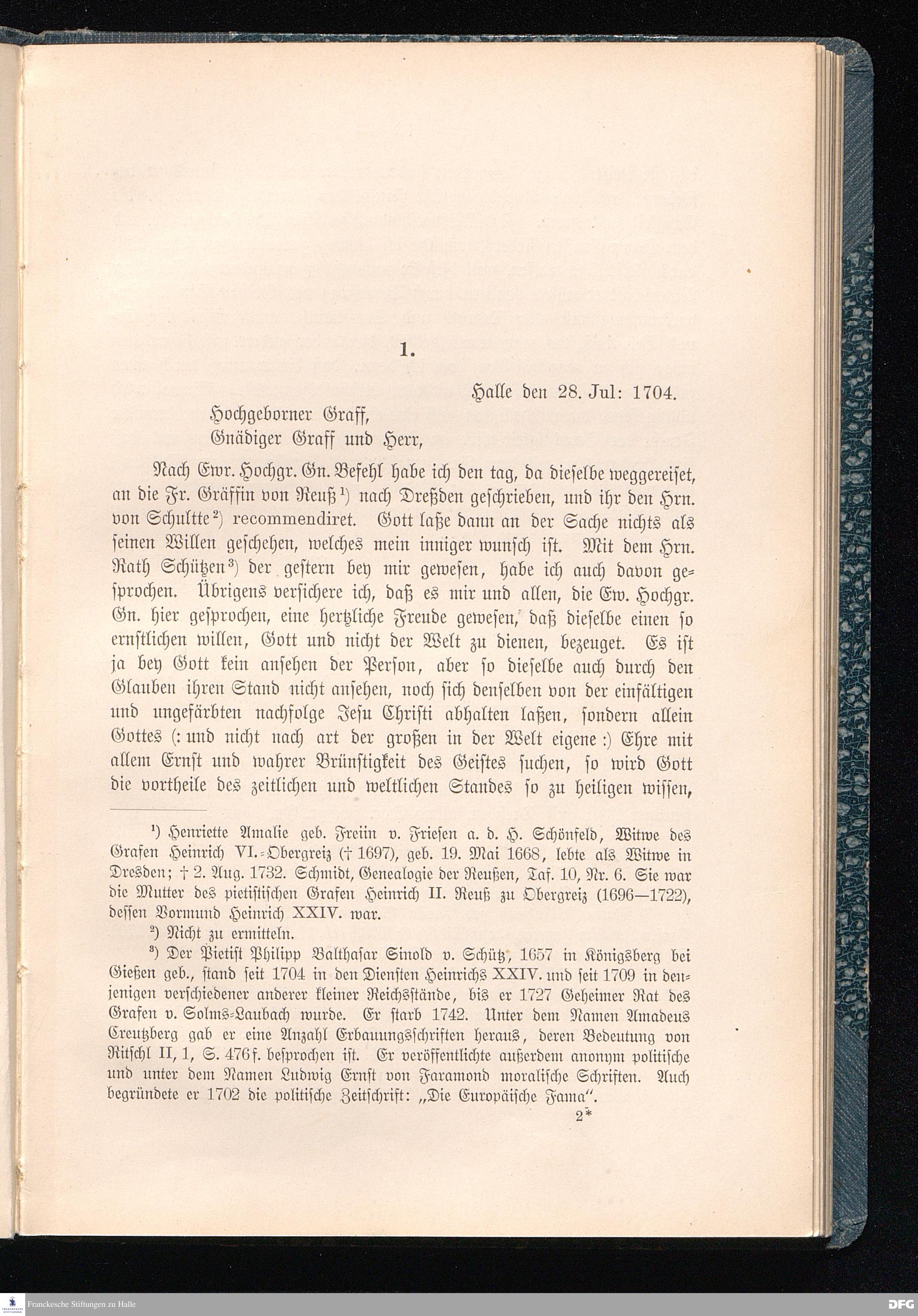 A.H.Franckes Briefe an den Grafen Heinrich XXIV. j.L. Reuß zu Köstritz und seine Gemahlin Eleonore aus den Jahren 1704 bis 1727 als Beitrag zur Geschichte des Pietismus herausgegeben von Dr.Berthold Schmidt Fürstl.Reuß j.L.Archivrat und Lic.theol. Otto Meusel Gymnasialoberlehrer in Schleiz. Leipzig, Verlag der Dürr'schen Buchhandlung 1905.