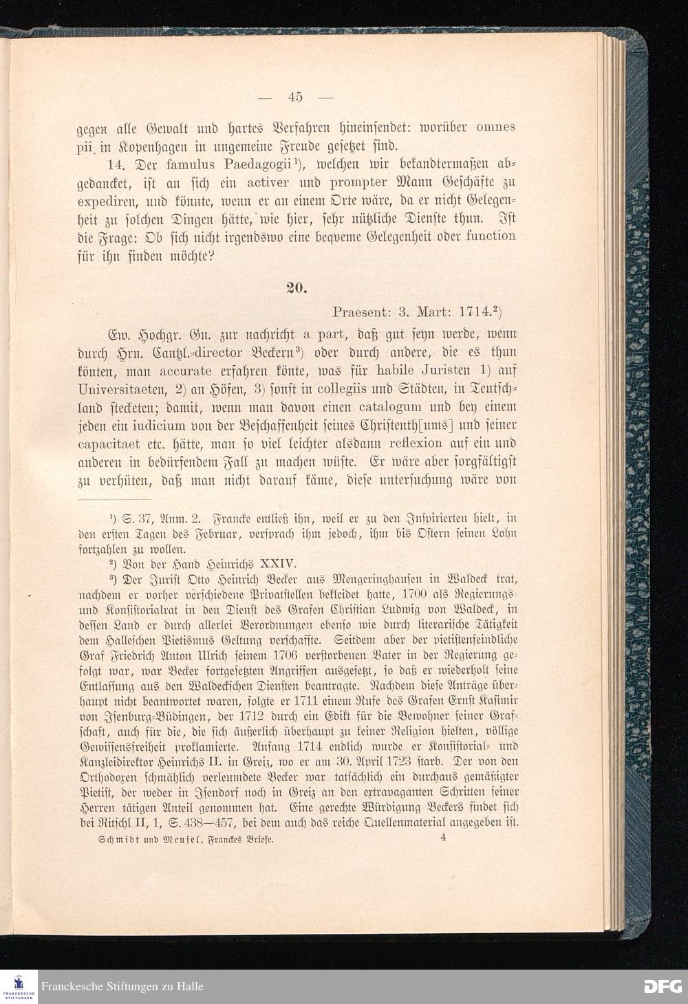 A.H.Franckes Briefe an den Grafen Heinrich XXIV. j.L. Reuß zu Köstritz und seine Gemahlin Eleonore aus den Jahren 1704 bis 1727 als Beitrag zur Geschichte des Pietismus herausgegeben von Dr.Berthold Schmidt Fürstl.Reuß j.L.Archivrat und Lic.theol. Otto Meusel Gymnasialoberlehrer in Schleiz. Leipzig, Verlag der Dürr'schen Buchhandlung 1905.