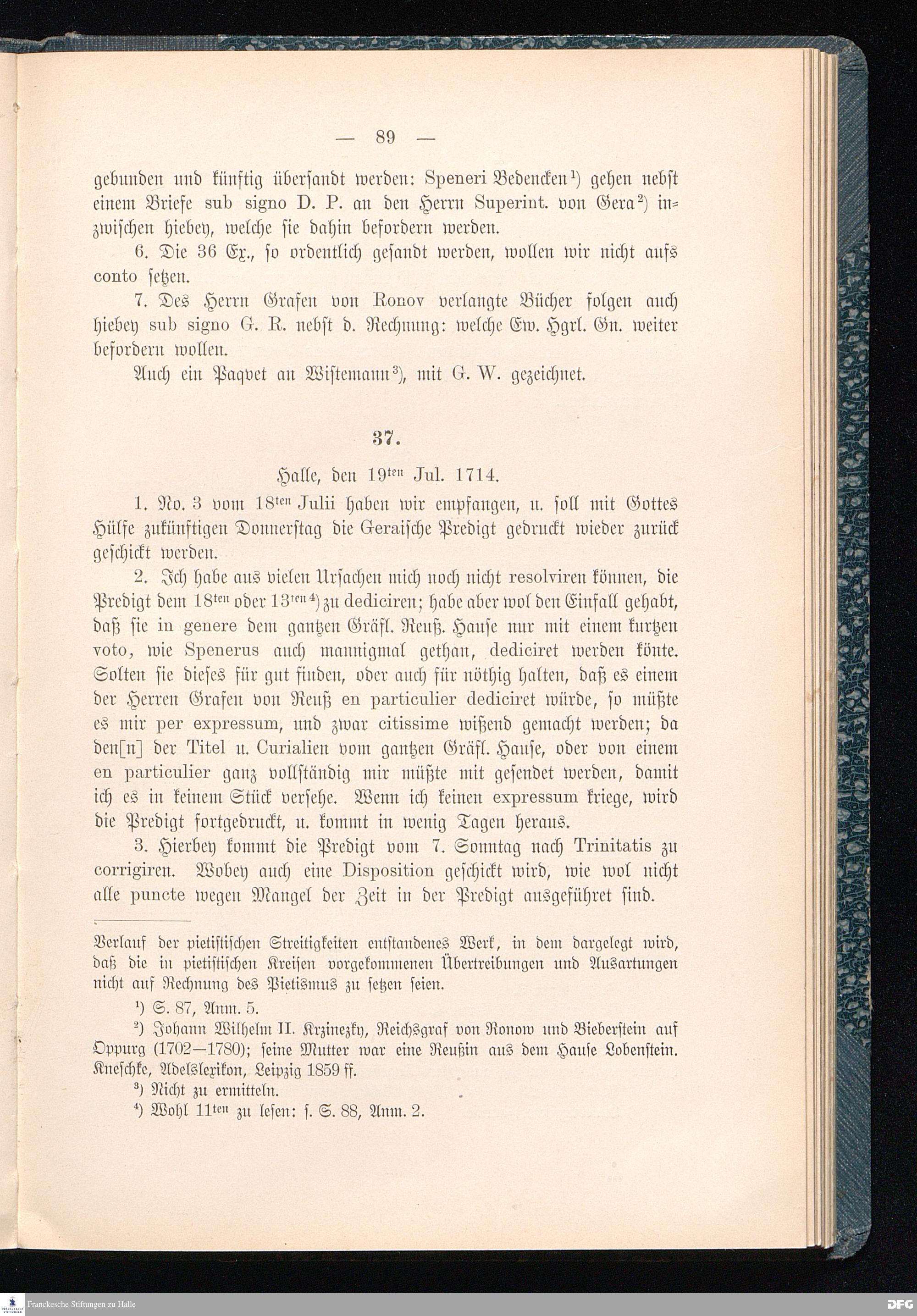 A.H.Franckes Briefe an den Grafen Heinrich XXIV. j.L. Reuß zu Köstritz und seine Gemahlin Eleonore aus den Jahren 1704 bis 1727 als Beitrag zur Geschichte des Pietismus herausgegeben von Dr.Berthold Schmidt Fürstl.Reuß j.L.Archivrat und Lic.theol. Otto Meusel Gymnasialoberlehrer in Schleiz. Leipzig, Verlag der Dürr'schen Buchhandlung 1905.