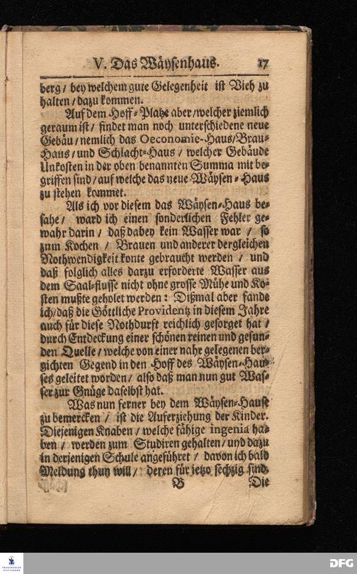 Wahrhafte und umständliche Nachricht Von dem Bißherigen und gegenwärtigen ZUSTANDE Des Wäysen=Hauses und der übrigen Anstalten Zu Glaucha vor Halle / In zweyen Send=Schreiben verfasset. Zum Druck gegeben von August Hermann Francken / S.Theol.Prof.zu Halle und Past.zu Glaucha vor Halle. [Bibelzitat.] HALLE / in Verlegung des Wäysenhauses, MDCCVII