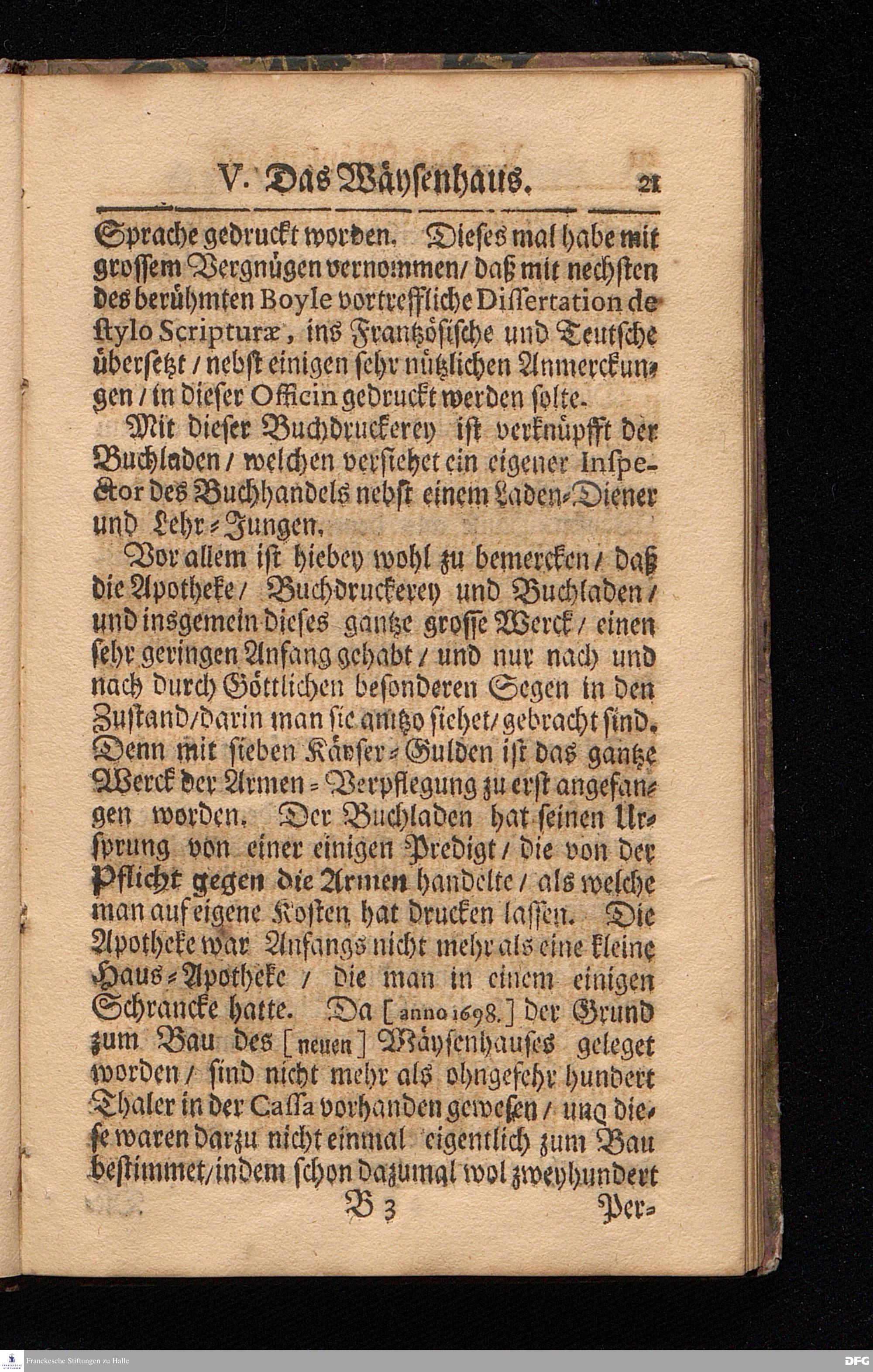 Wahrhafte und umständliche Nachricht Von dem Bißherigen und gegenwärtigen ZUSTANDE Des Wäysen=Hauses und der übrigen Anstalten Zu Glaucha vor Halle / In zweyen Send=Schreiben verfasset. Zum Druck gegeben von August Hermann Francken / S.Theol.Prof.zu Halle und Past.zu Glaucha vor Halle. [Bibelzitat.] HALLE / in Verlegung des Wäysenhauses, MDCCVII