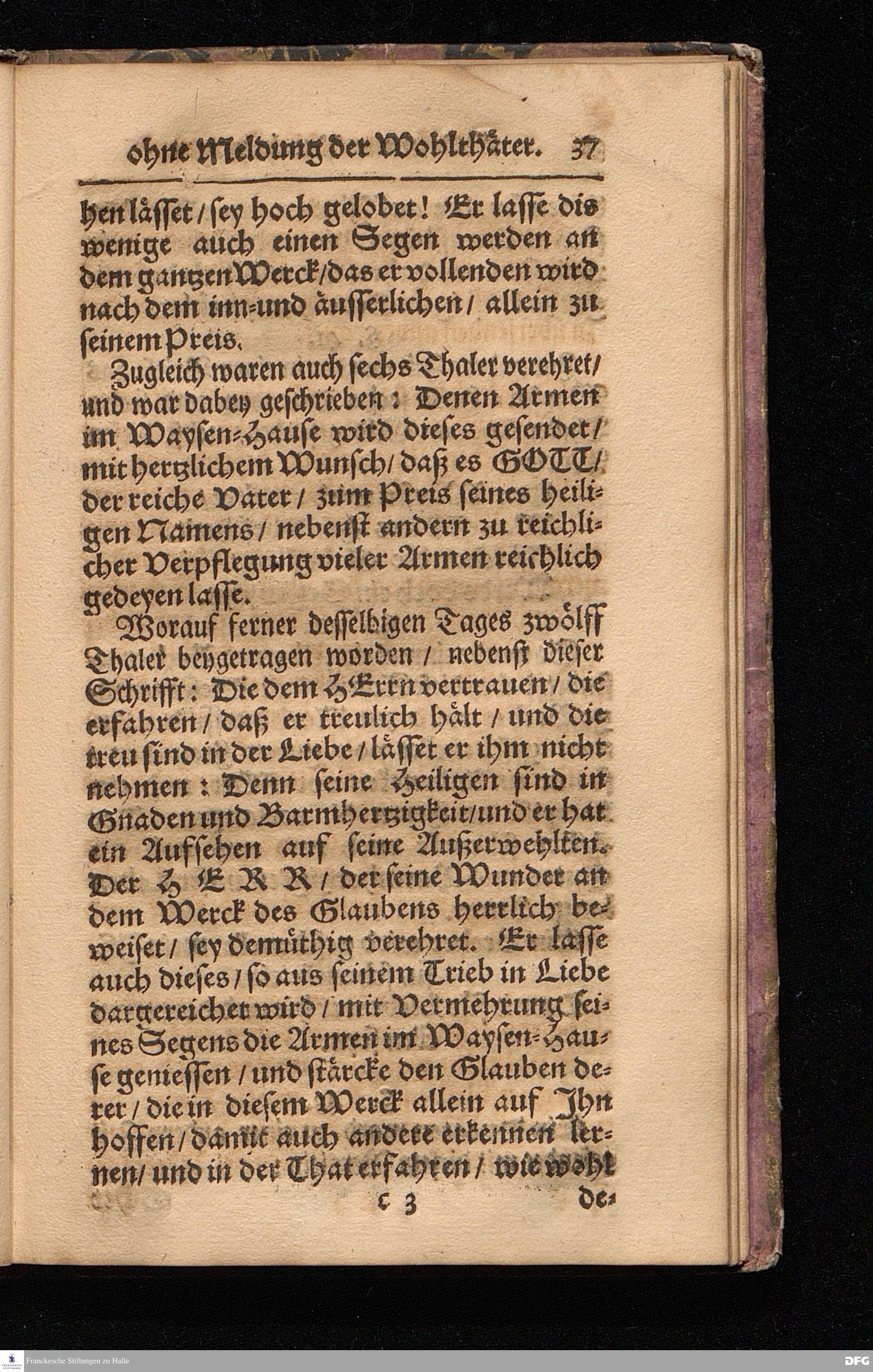 Wahrhafte und umständliche Nachricht Von dem Bißherigen und gegenwärtigen ZUSTANDE Des Wäysen=Hauses und der übrigen Anstalten Zu Glaucha vor Halle / In zweyen Send=Schreiben verfasset. Zum Druck gegeben von August Hermann Francken / S.Theol.Prof.zu Halle und Past.zu Glaucha vor Halle. [Bibelzitat.] HALLE / in Verlegung des Wäysenhauses, MDCCVII