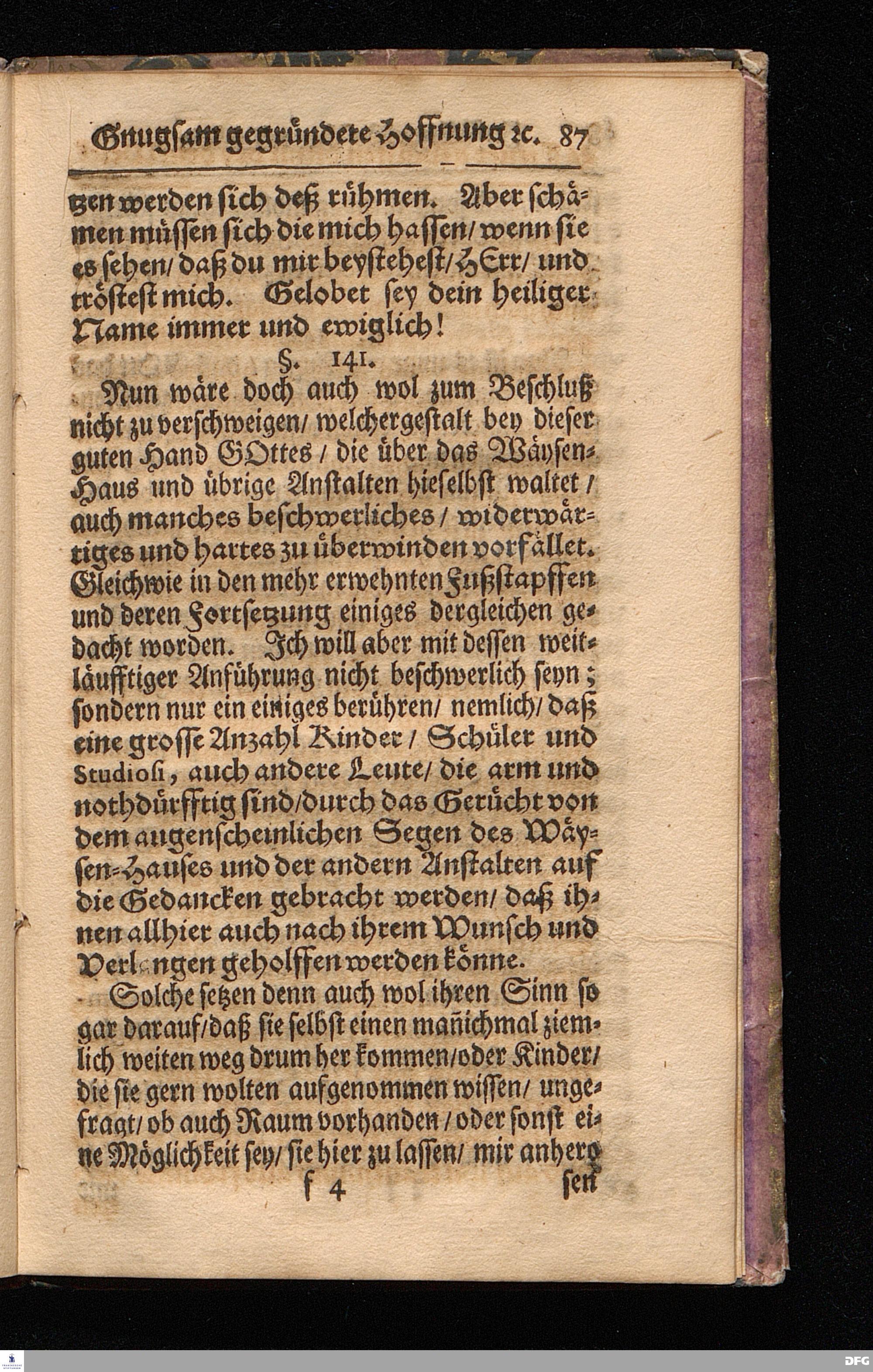Wahrhafte und umständliche Nachricht Von dem Bißherigen und gegenwärtigen ZUSTANDE Des Wäysen=Hauses und der übrigen Anstalten Zu Glaucha vor Halle / In zweyen Send=Schreiben verfasset. Zum Druck gegeben von August Hermann Francken / S.Theol.Prof.zu Halle und Past.zu Glaucha vor Halle. [Bibelzitat.] HALLE / in Verlegung des Wäysenhauses, MDCCVII