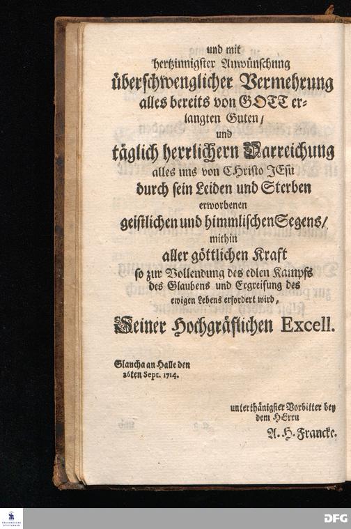 August Hermann Franckens S.Theol.Prof.Ord.und Past. Oeffentliche Reden über die Paßions=Historie / Wie dieselbe vom Evangelisten Marco im 14. und 15. Cap. beschrieben ist / gehalten Von Esto mihi bis Ostern 1712, In dem Wäysenhause zu Glaucha an Halle. Dritte Edition. HALLE, Gedruckt und verlegt im Wäysenhause, MDCCXXIV.