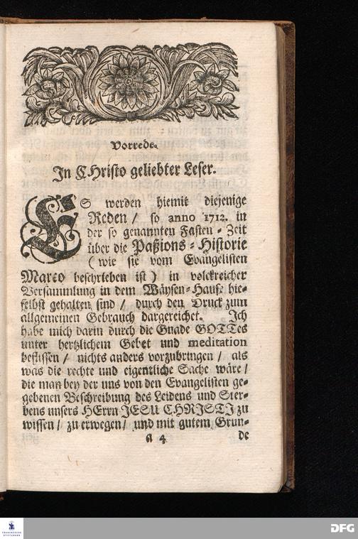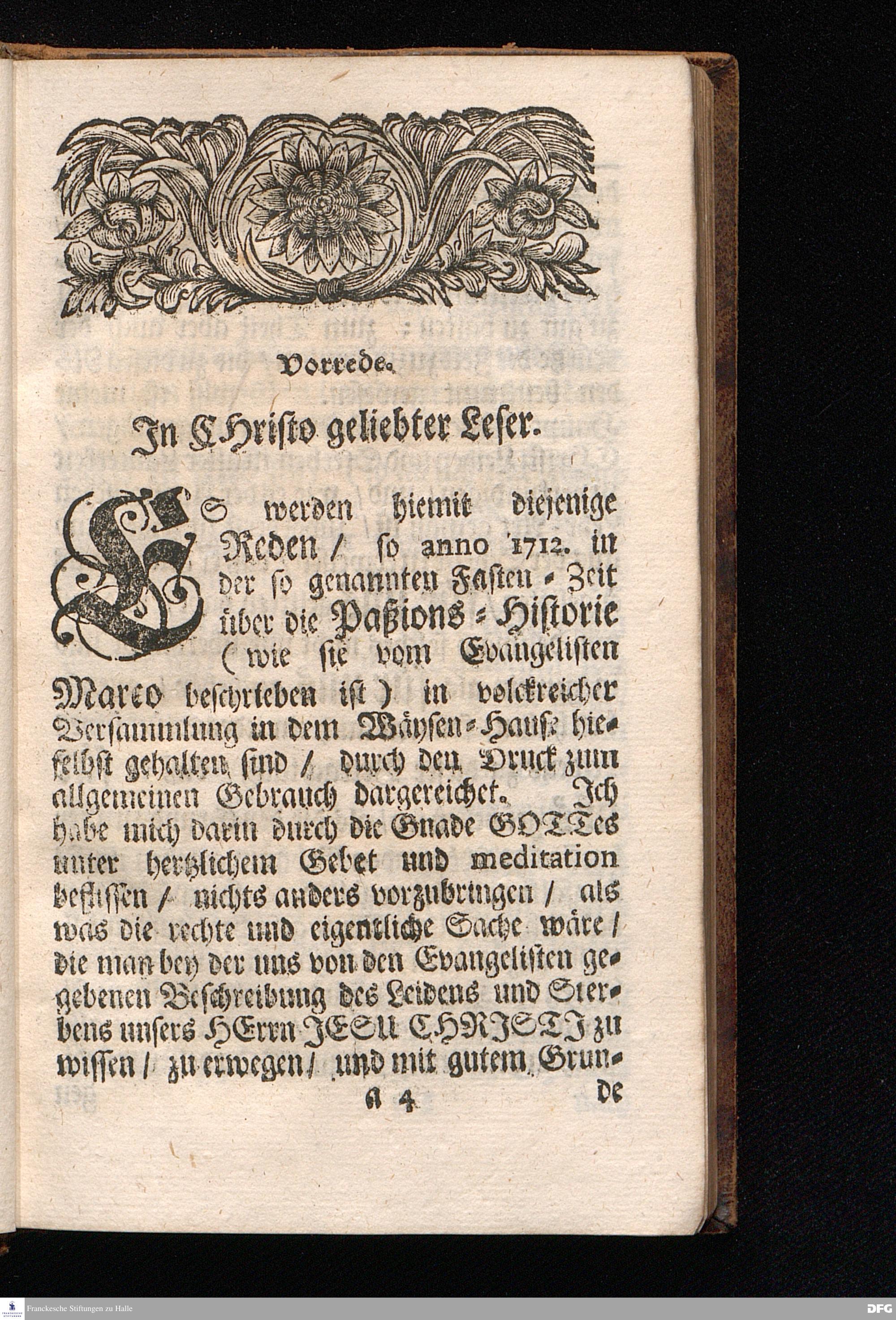 August Hermann Franckens S.Theol.Prof.Ord.und Past. Oeffentliche Reden über die Paßions=Historie / Wie dieselbe vom Evangelisten Marco im 14. und 15. Cap. beschrieben ist / gehalten Von Esto mihi bis Ostern 1712, In dem Wäysenhause zu Glaucha an Halle. Dritte Edition. HALLE, Gedruckt und verlegt im Wäysenhause, MDCCXXIV.