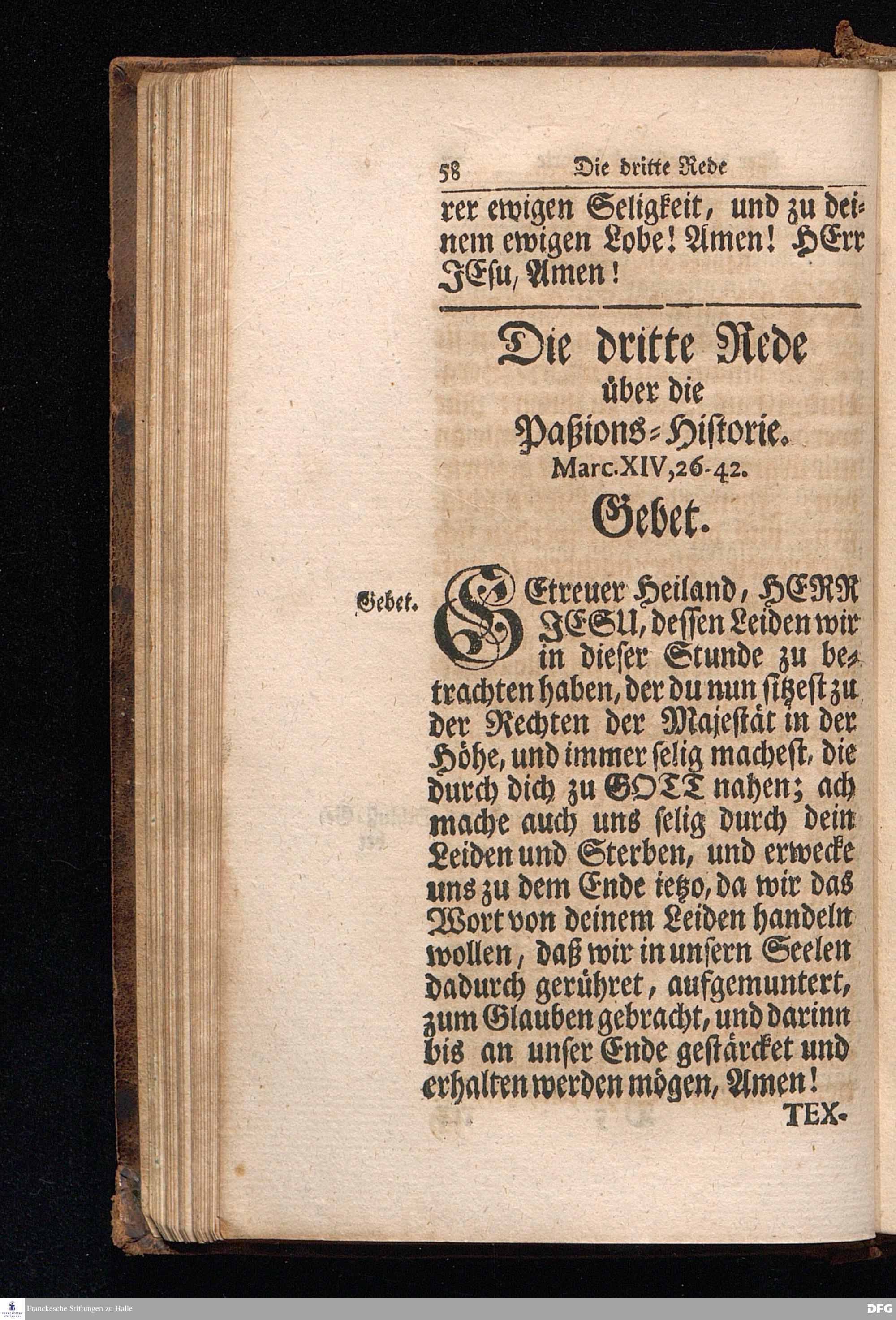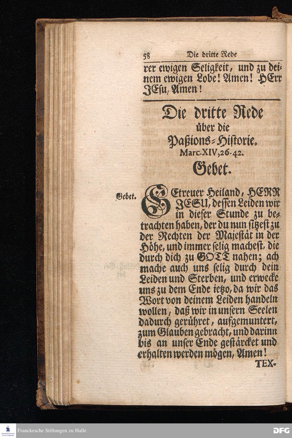 August Hermann Franckens S.Theol.Prof.Ord.und Past. Oeffentliche Reden über die Paßions=Historie / Wie dieselbe vom Evangelisten Marco im 14. und 15. Cap. beschrieben ist / gehalten Von Esto mihi bis Ostern 1712, In dem Wäysenhause zu Glaucha an Halle. Dritte Edition. HALLE, Gedruckt und verlegt im Wäysenhause, MDCCXXIV.