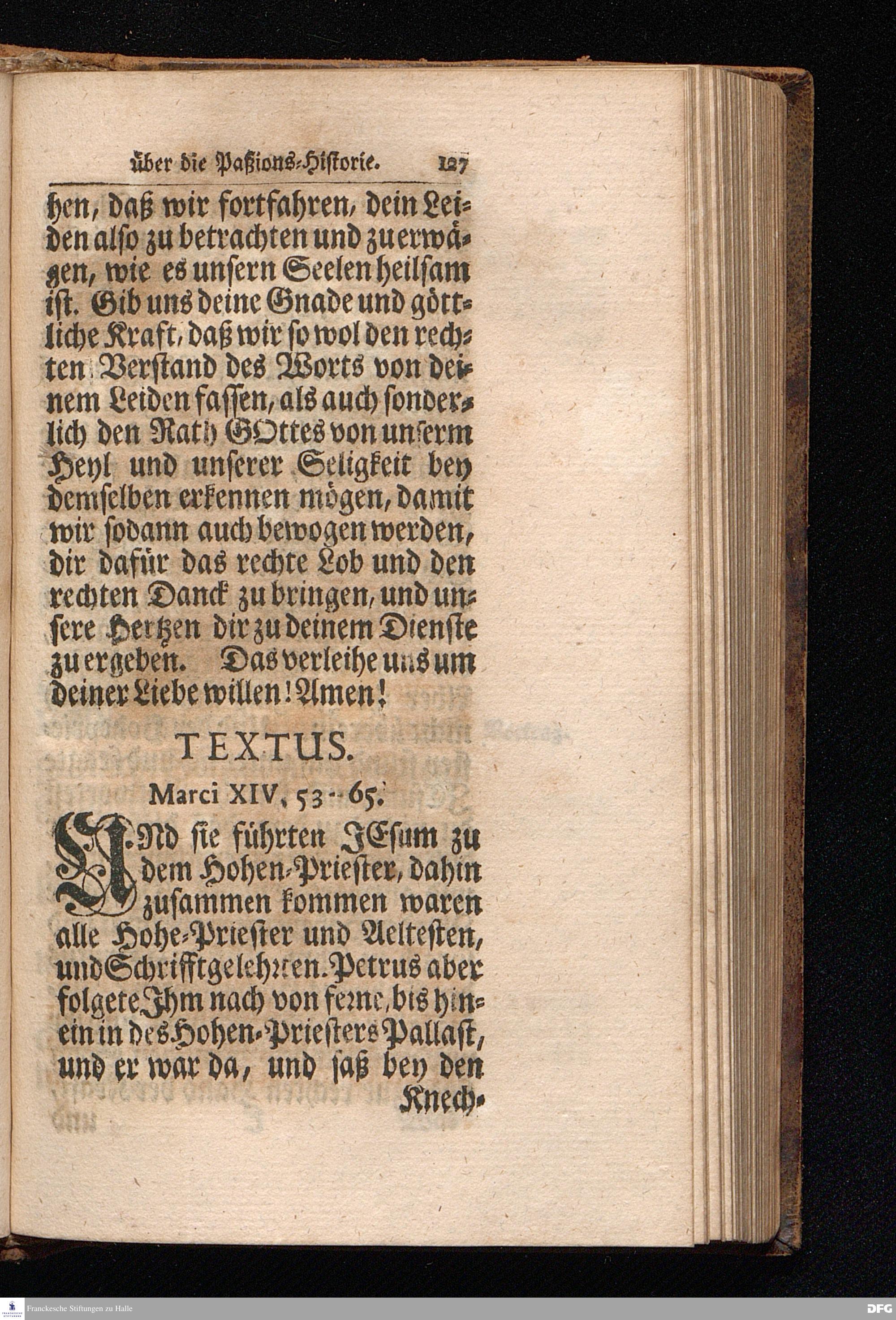 August Hermann Franckens S.Theol.Prof.Ord.und Past. Oeffentliche Reden über die Paßions=Historie / Wie dieselbe vom Evangelisten Marco im 14. und 15. Cap. beschrieben ist / gehalten Von Esto mihi bis Ostern 1712, In dem Wäysenhause zu Glaucha an Halle. Dritte Edition. HALLE, Gedruckt und verlegt im Wäysenhause, MDCCXXIV.