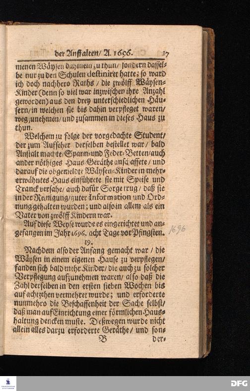 Die Fußstapfen Des noch lebenden und waltenden liebreichen und getreuen GOttes / Zur Beschämung des Unglaubens und Stärckung des Glaubens / entdecket durch eine Wahrhaffte und umständliche Nachricht von dem Wäysen=Hause und übrigen Anstalten zu Glaucha vor Halle: Welche bey gewisser Gelegenheit abgefasset / auch im Jahr 1701. zum Druck befördert / Jetzo aber Zum andernmal herausgegeben / und bis auf gegenwärtiges Jahr fortgesetzet von August Herm.Francken / SS.Theol.Prof.Publ.und Past.zu Glaucha vor Halle. Halle / in Verlegung des Waysen=Hauses MDCCVIII.