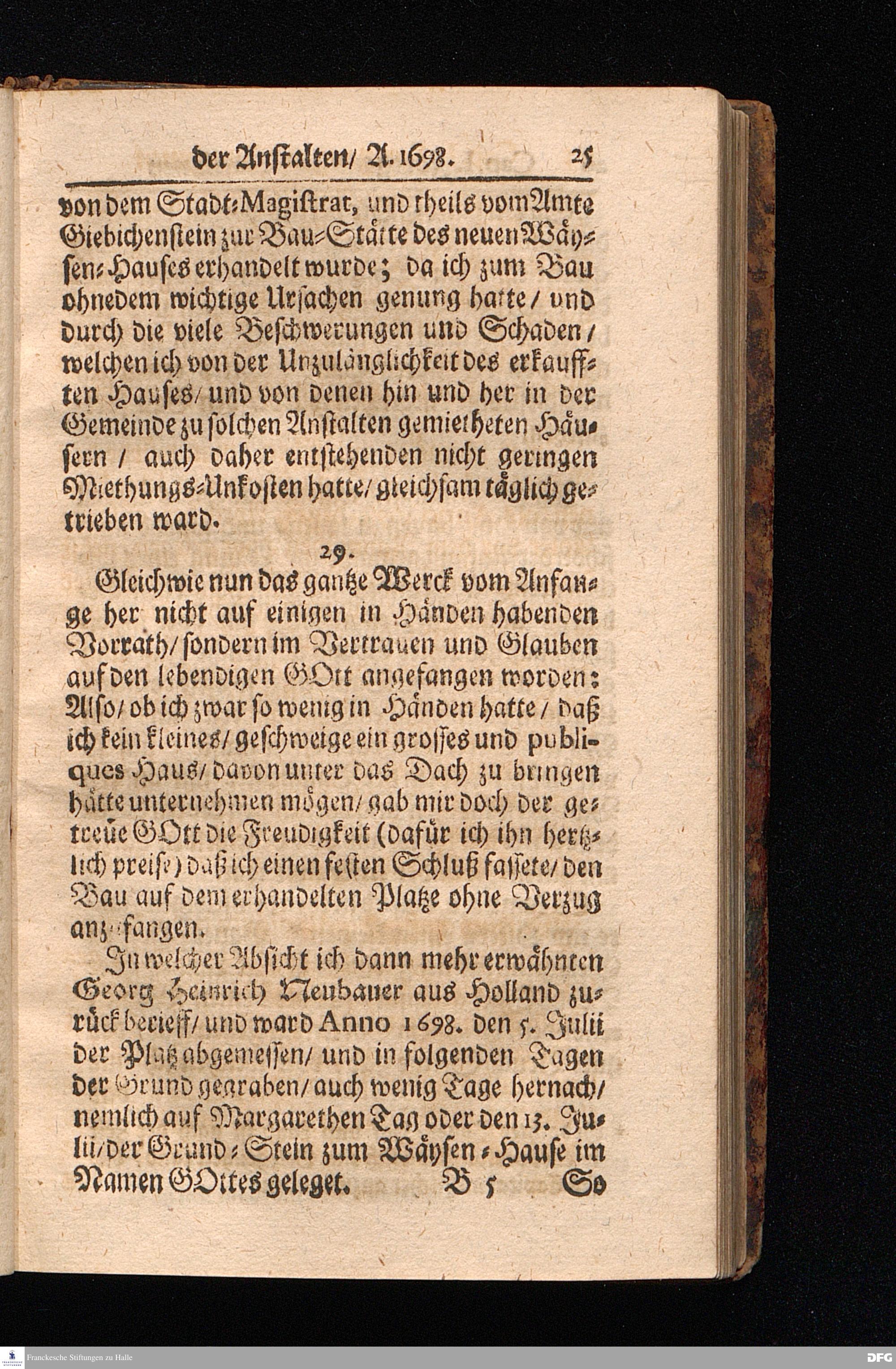 Die Fußstapfen Des noch lebenden und waltenden liebreichen und getreuen GOttes / Zur Beschämung des Unglaubens und Stärckung des Glaubens / entdecket durch eine Wahrhaffte und umständliche Nachricht von dem Wäysen=Hause und übrigen Anstalten zu Glaucha vor Halle: Welche bey gewisser Gelegenheit abgefasset / auch im Jahr 1701. zum Druck befördert / Jetzo aber Zum andernmal herausgegeben / und bis auf gegenwärtiges Jahr fortgesetzet von August Herm.Francken / SS.Theol.Prof.Publ.und Past.zu Glaucha vor Halle. Halle / in Verlegung des Waysen=Hauses MDCCVIII.