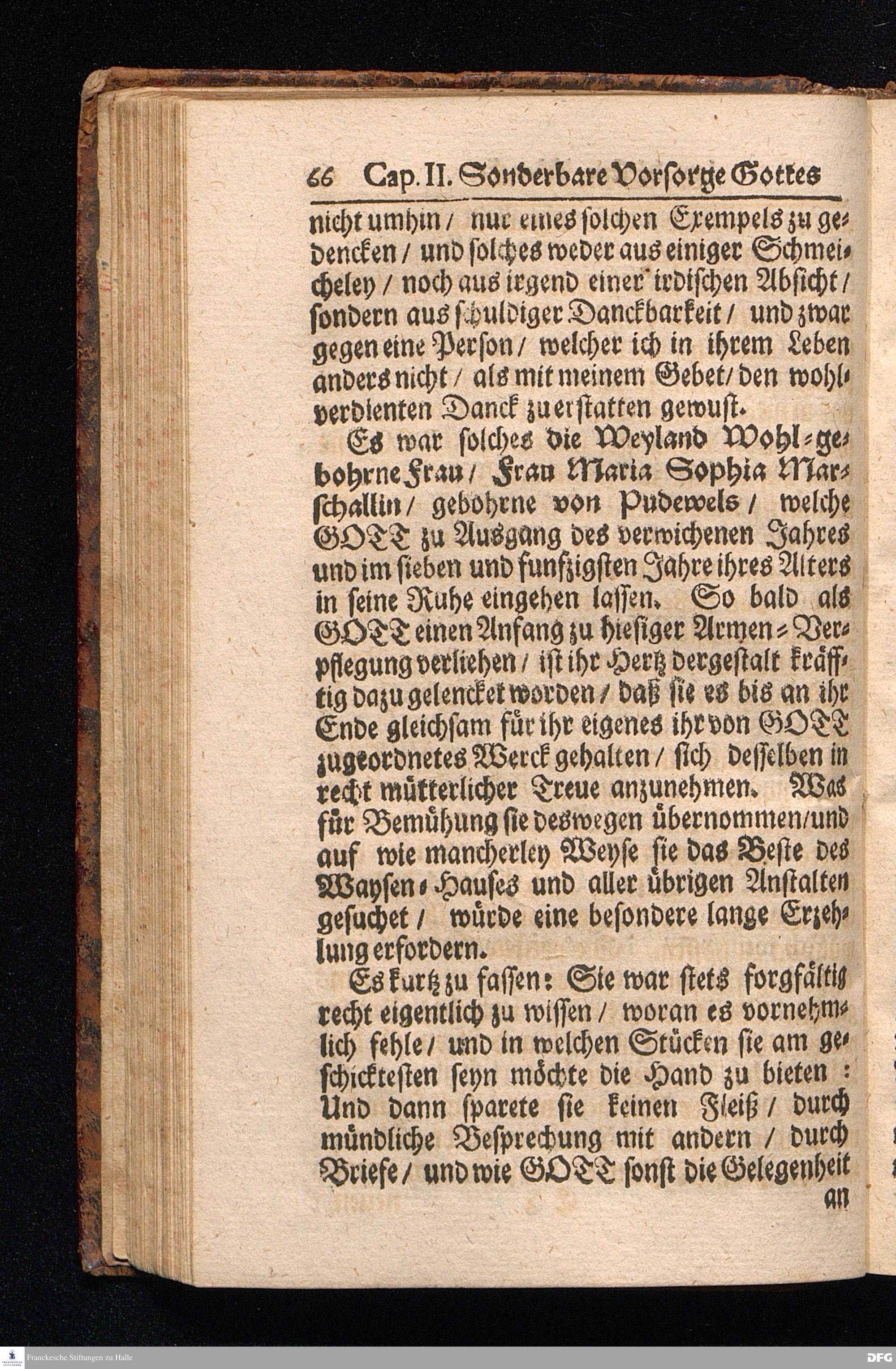 Die Fußstapfen Des noch lebenden und waltenden liebreichen und getreuen GOttes / Zur Beschämung des Unglaubens und Stärckung des Glaubens / entdecket durch eine Wahrhaffte und umständliche Nachricht von dem Wäysen=Hause und übrigen Anstalten zu Glaucha vor Halle: Welche bey gewisser Gelegenheit abgefasset / auch im Jahr 1701. zum Druck befördert / Jetzo aber Zum andernmal herausgegeben / und bis auf gegenwärtiges Jahr fortgesetzet von August Herm.Francken / SS.Theol.Prof.Publ.und Past.zu Glaucha vor Halle. Halle / in Verlegung des Waysen=Hauses MDCCVIII.
