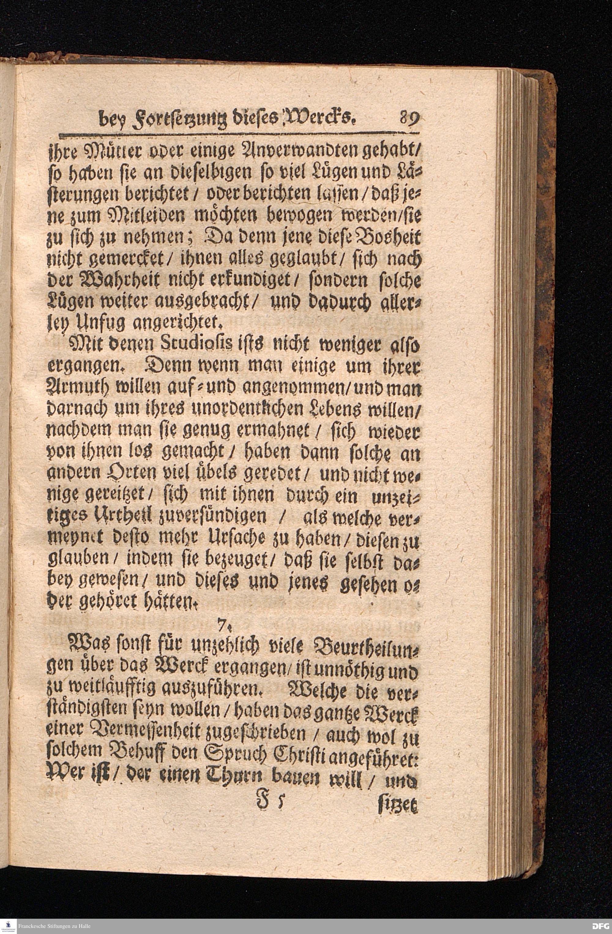 Die Fußstapfen Des noch lebenden und waltenden liebreichen und getreuen GOttes / Zur Beschämung des Unglaubens und Stärckung des Glaubens / entdecket durch eine Wahrhaffte und umständliche Nachricht von dem Wäysen=Hause und übrigen Anstalten zu Glaucha vor Halle: Welche bey gewisser Gelegenheit abgefasset / auch im Jahr 1701. zum Druck befördert / Jetzo aber Zum andernmal herausgegeben / und bis auf gegenwärtiges Jahr fortgesetzet von August Herm.Francken / SS.Theol.Prof.Publ.und Past.zu Glaucha vor Halle. Halle / in Verlegung des Waysen=Hauses MDCCVIII.