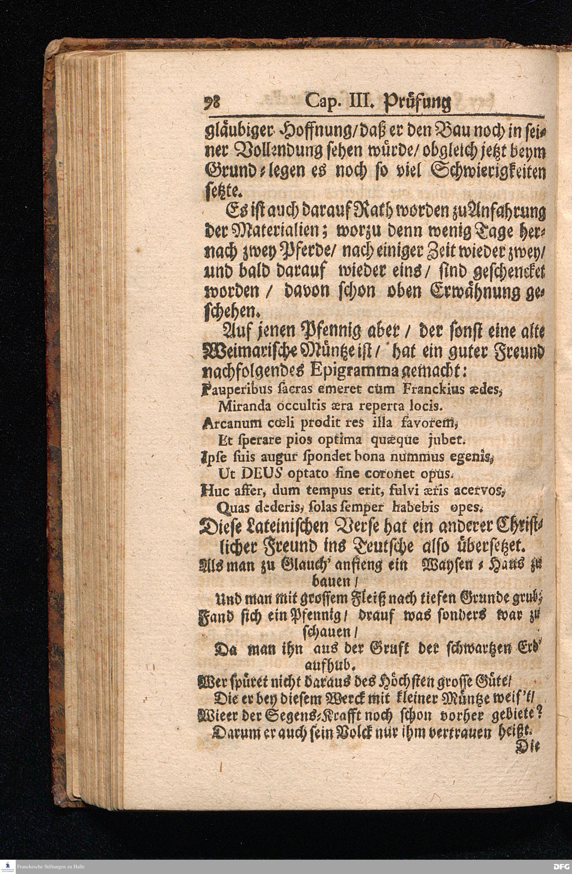 Die Fußstapfen Des noch lebenden und waltenden liebreichen und getreuen GOttes / Zur Beschämung des Unglaubens und Stärckung des Glaubens / entdecket durch eine Wahrhaffte und umständliche Nachricht von dem Wäysen=Hause und übrigen Anstalten zu Glaucha vor Halle: Welche bey gewisser Gelegenheit abgefasset / auch im Jahr 1701. zum Druck befördert / Jetzo aber Zum andernmal herausgegeben / und bis auf gegenwärtiges Jahr fortgesetzet von August Herm.Francken / SS.Theol.Prof.Publ.und Past.zu Glaucha vor Halle. Halle / in Verlegung des Waysen=Hauses MDCCVIII.